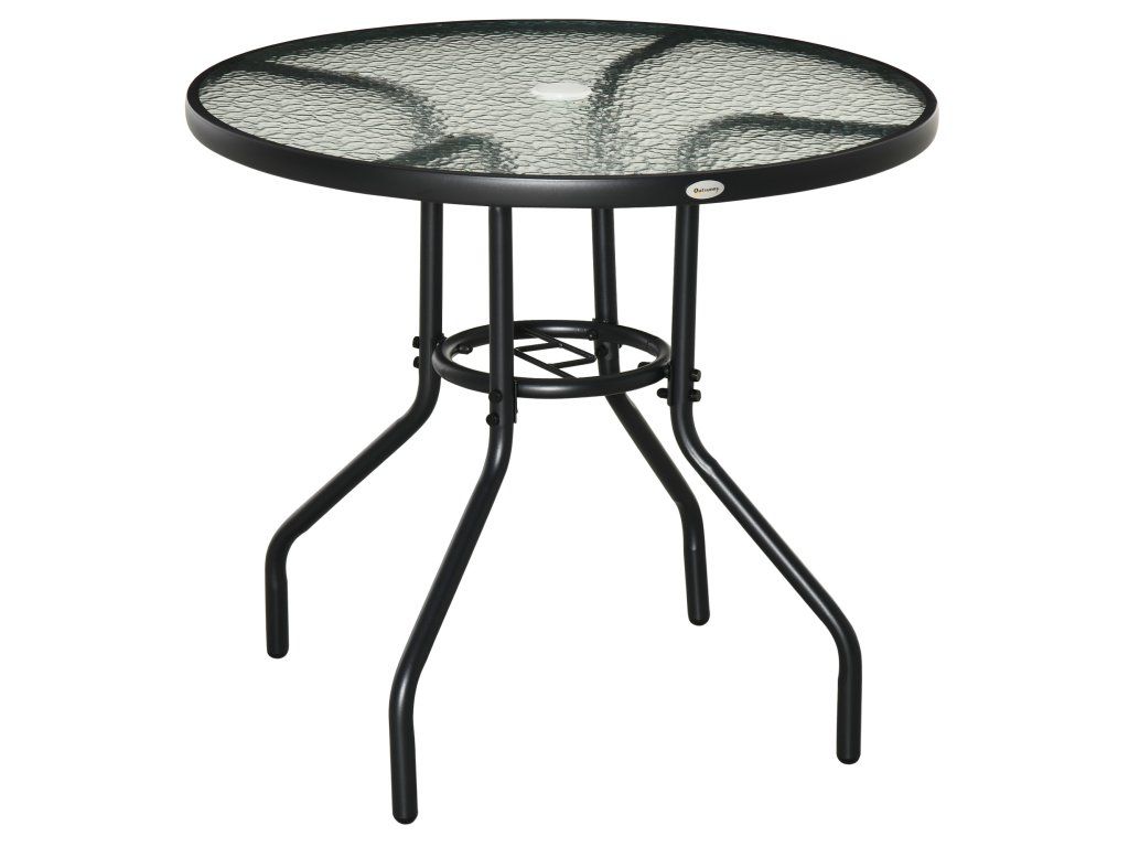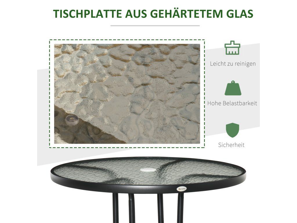 Outsunny Zahradní stůl Zahradní stolek Zahradní nábytek Balkonový stůl Bistro stůl s otvorem pro slunečník Tvrzené sklo + kov Černá Ø80 x 72 cm