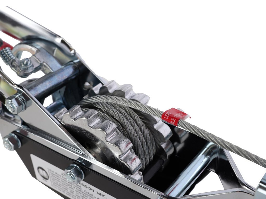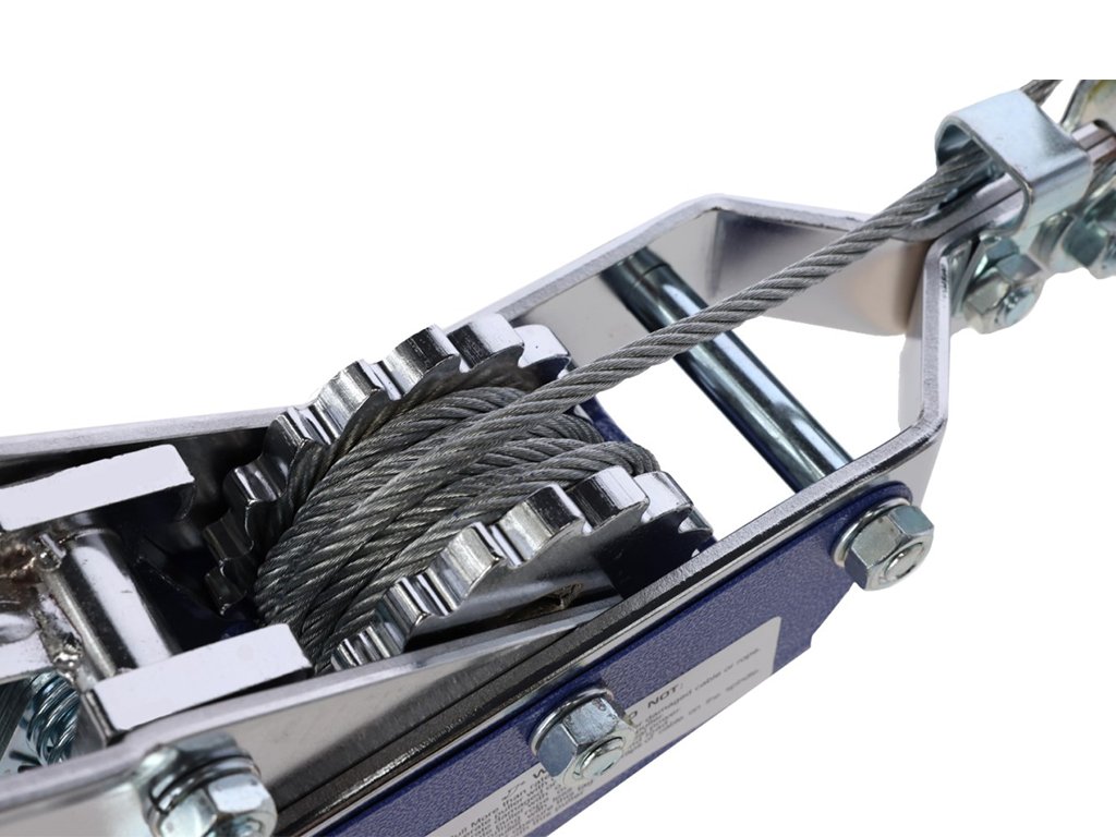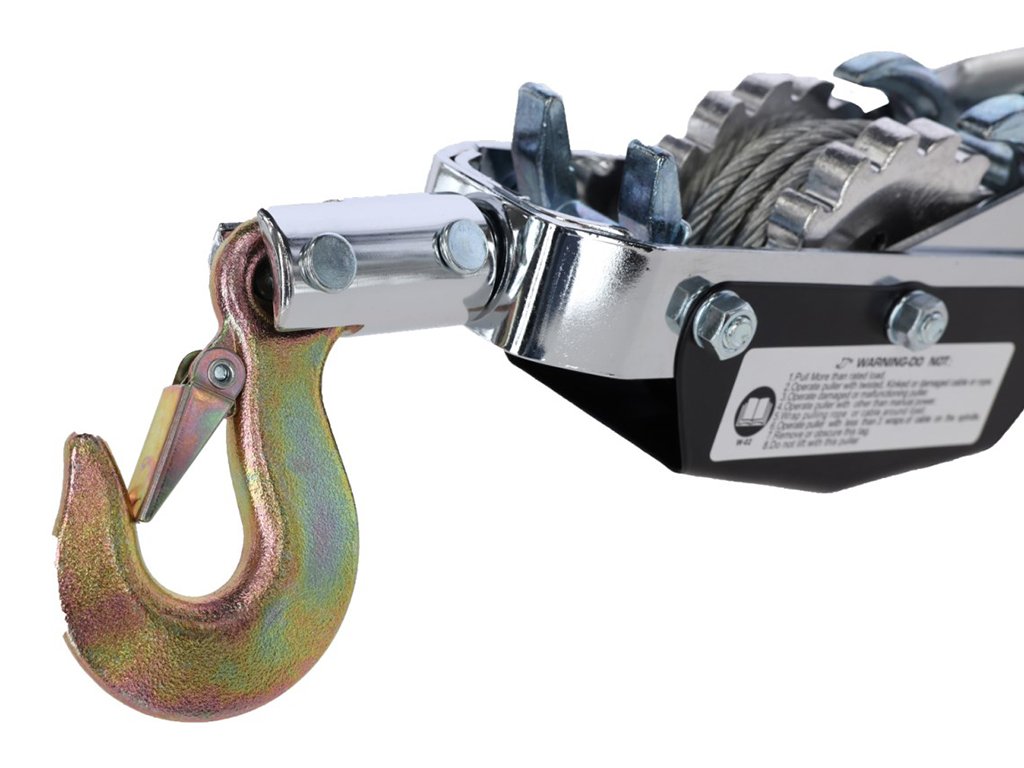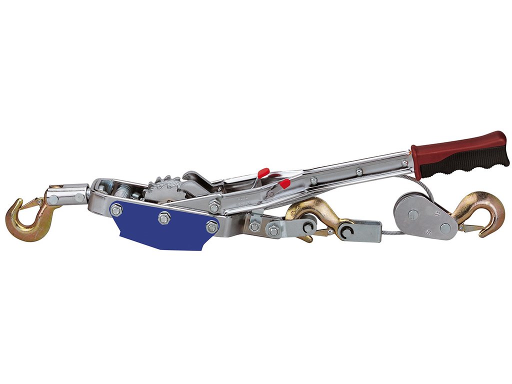 Pákový lanový naviják s ráčnou, pro lesnictví, zemědělství, zahradnictví, kempování, vhodné pro tahání a napínání, ocelový hák otočný o 360°, hák s bezpečnostním poutkem, robustní páka s pogumovanou rukojetí, páka 15:1, trojité zabezpečení, zajištěno automatickou brzdou, maximální zatížení do 1 250 kg, stabilní ocelové lanko, délka lana 3 m, průměr lana 6 mm.