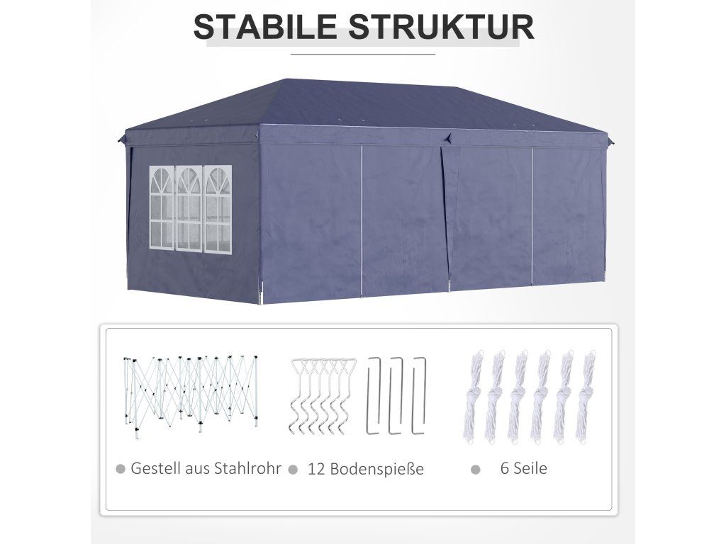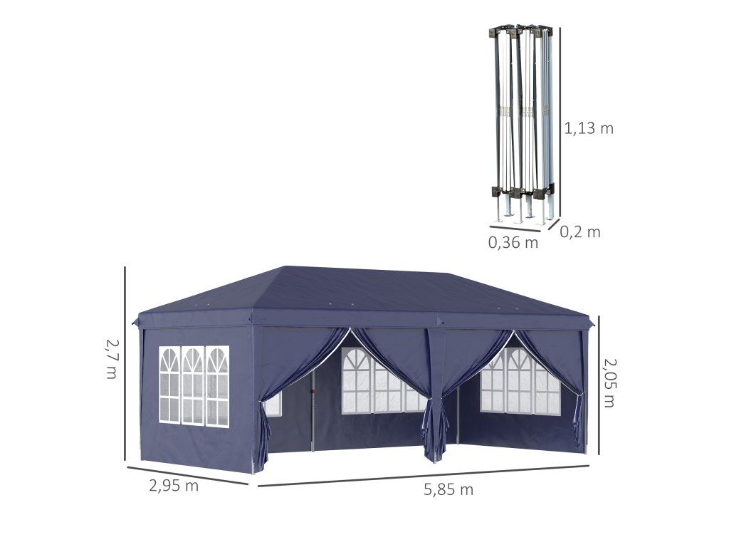 Bezpečná konstrukce: Ocelový rám, 6 napínacích lan a 12 zemních hrotů pomáhá tomuto zahradnímu altánu odolat větru a dešti a zajistit správnou stabilitu. Díky prostornému interiéru je ideální na terasu, zahradu a dvůr. Když se nepoužívá, snadno se složí a uloží do přiložené tašky.
