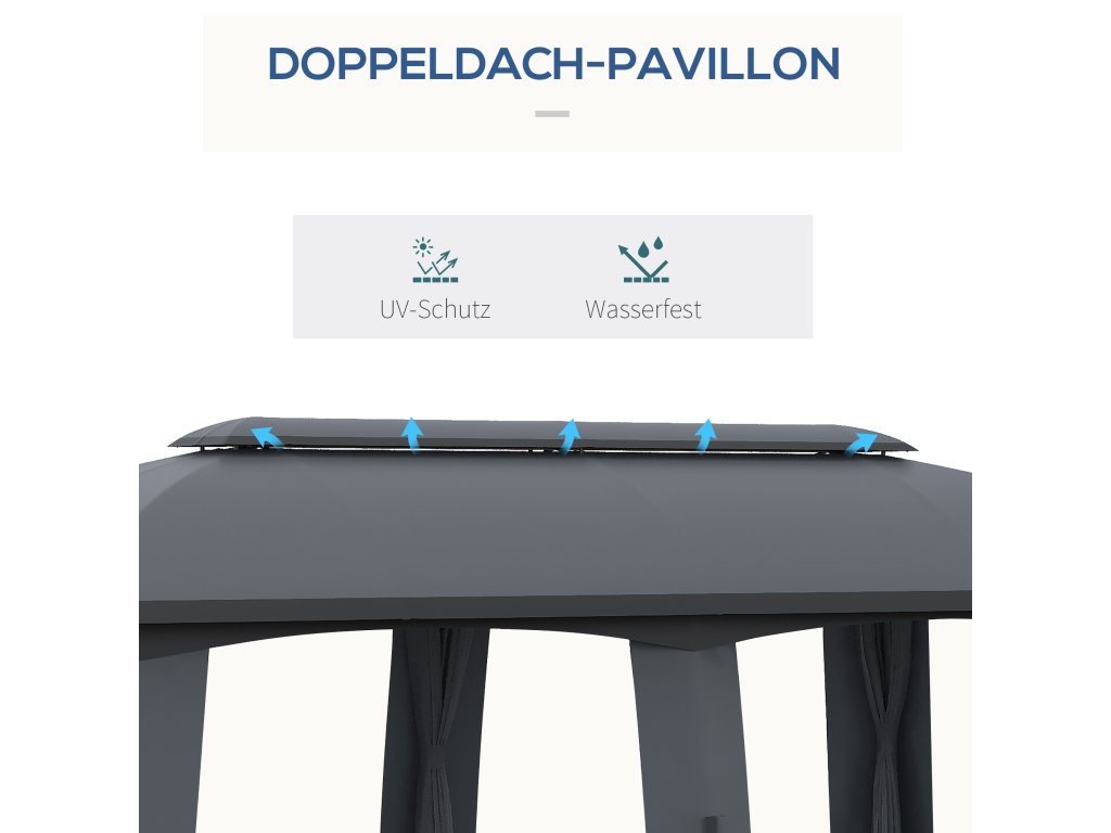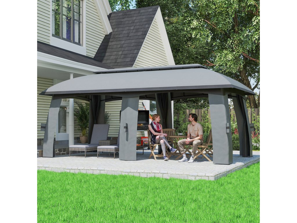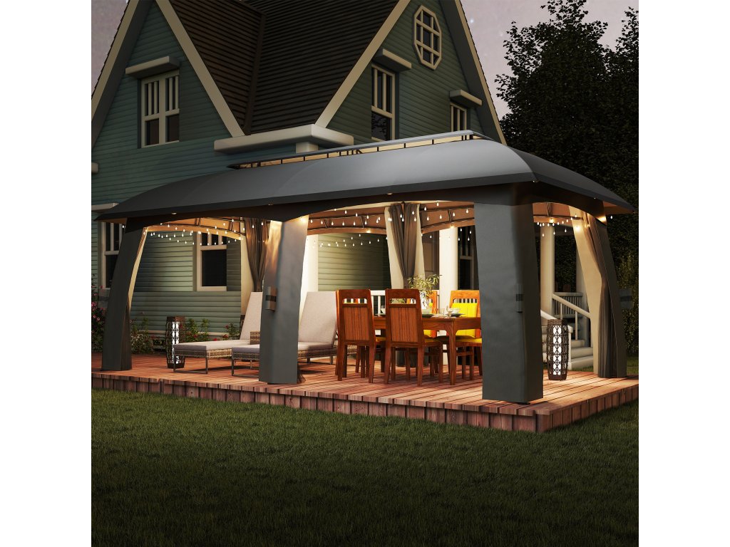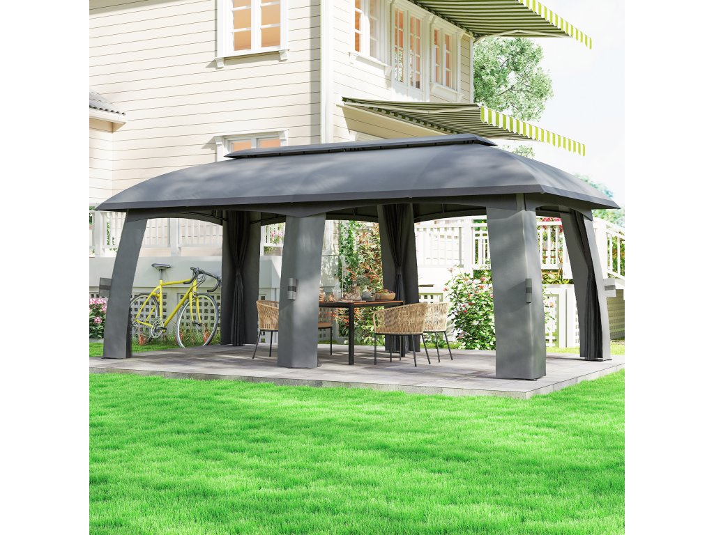 Outsunny vám nabízí možnost ubytovat až 15 osob, aniž byste se cítili stísněně nebo přeplněně. Tento pavilon o rozměrech 3 x 6 metrů poskytuje dostatek stínu, zatímco dodávané boční závěsy poskytují příjemné soukromí a chrání před hmyzem. Větrná stříška zajišťuje optimální větrání a větší stabilitu při větrném počasí. k bezpečnému upevnění altánu na místě vám pomůže také 12 dodávaných zemních hrotů.