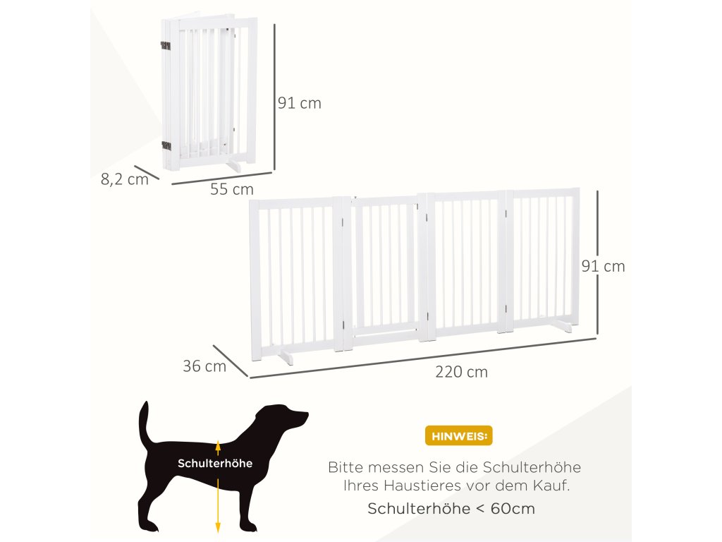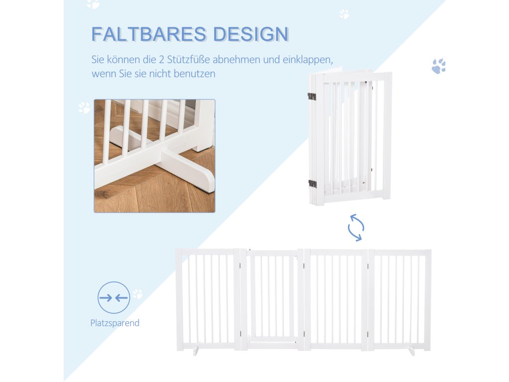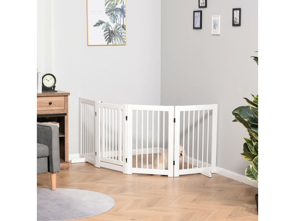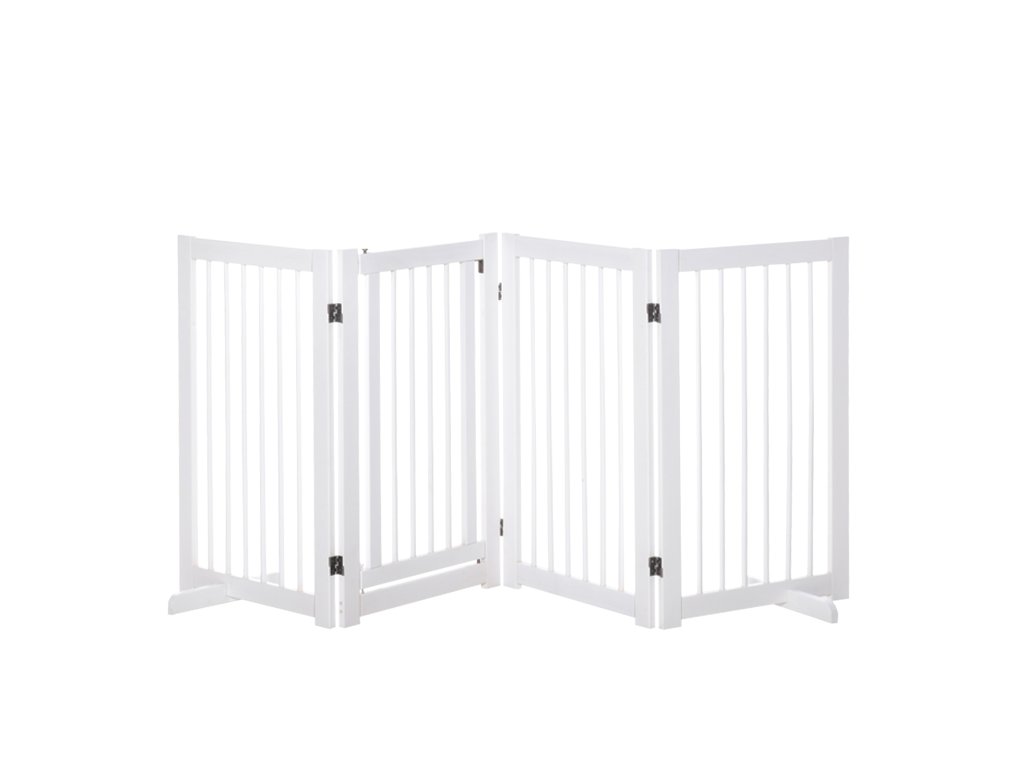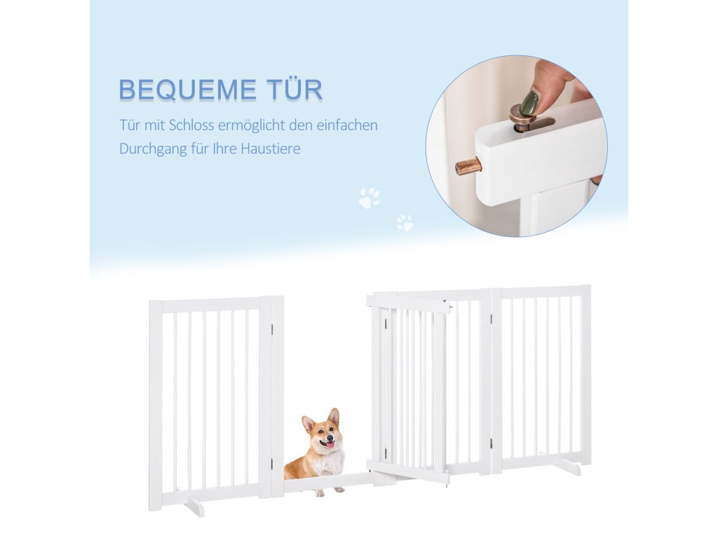 PawHut 4dílná zábrana pro psy, 220 x 91 cm Skládací bezpečnostní branka s dvířky, volně stojící branka pro psy se 2 opěrnými nožičkami, dřevěná branka na schody do chodby, kuchyně, na schody, bílá barva