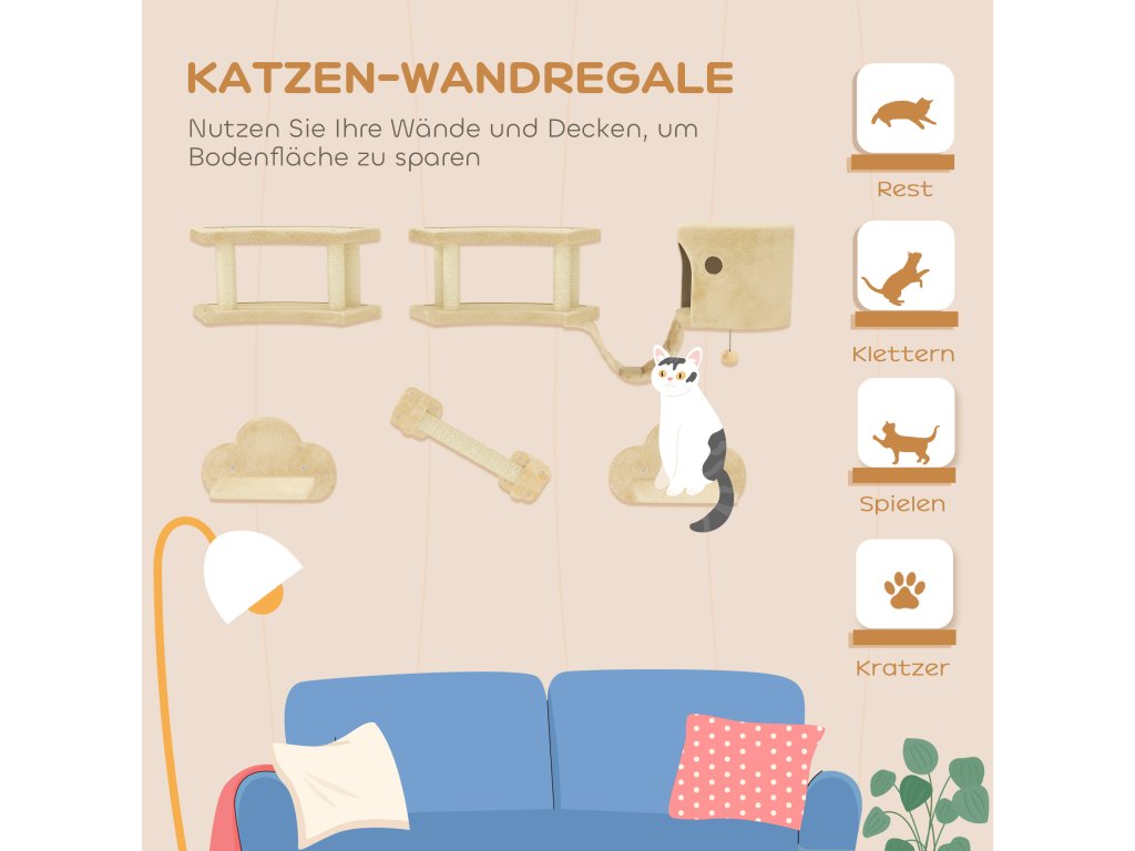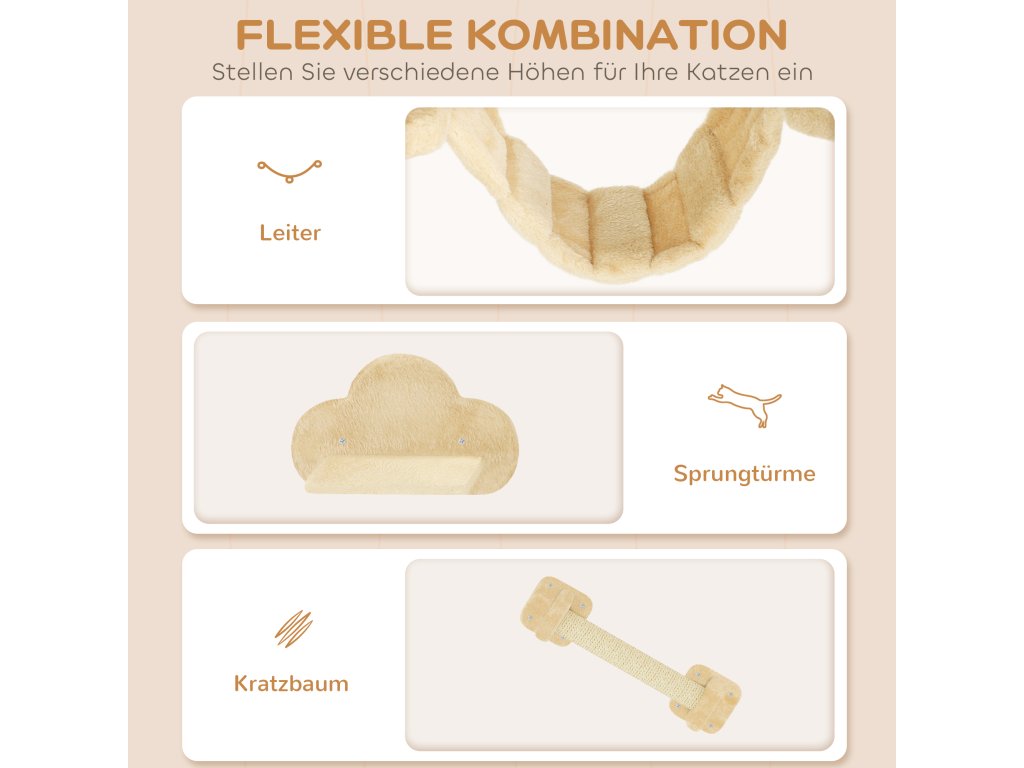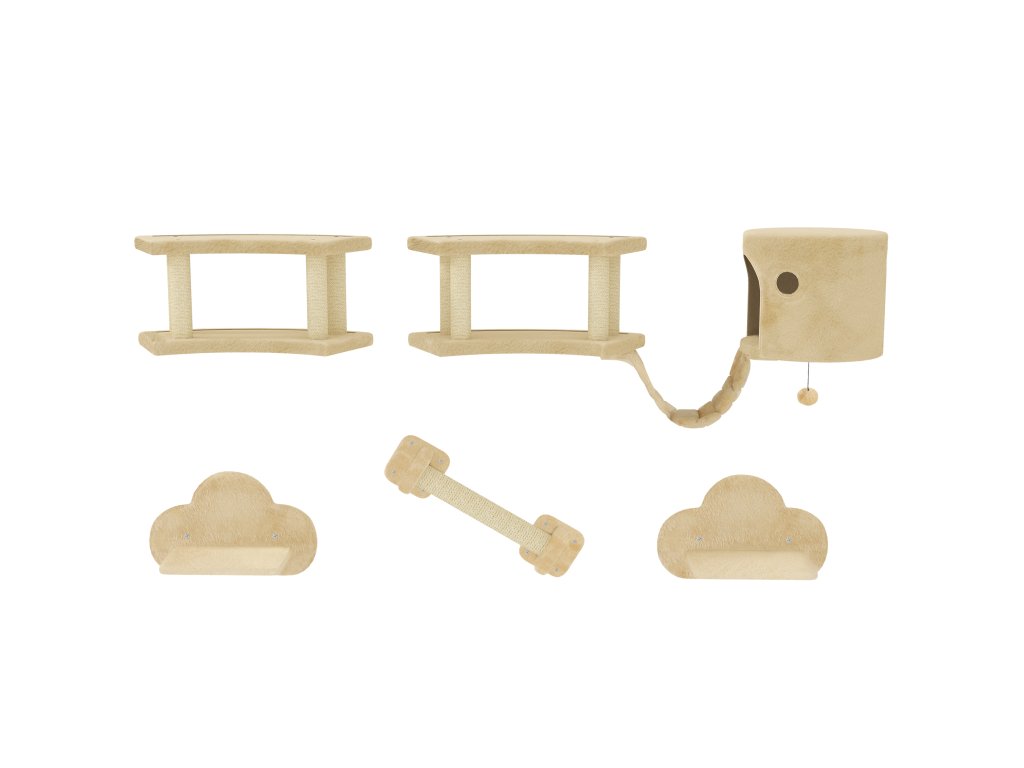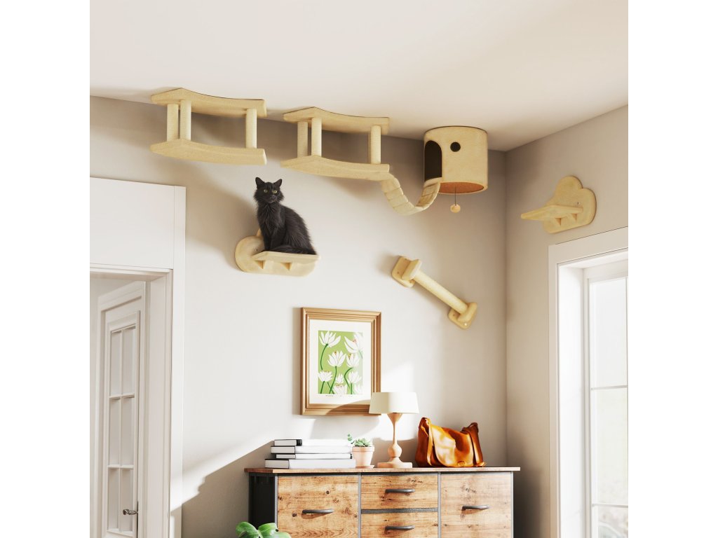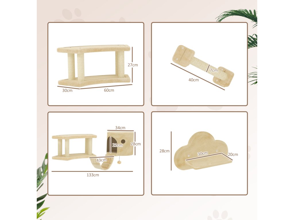 PawHut 5dílná prolézací sada pro kočky se škrabadly, skákacími plošinami, žebříkem, domeček, nástěnná, béžová barva
