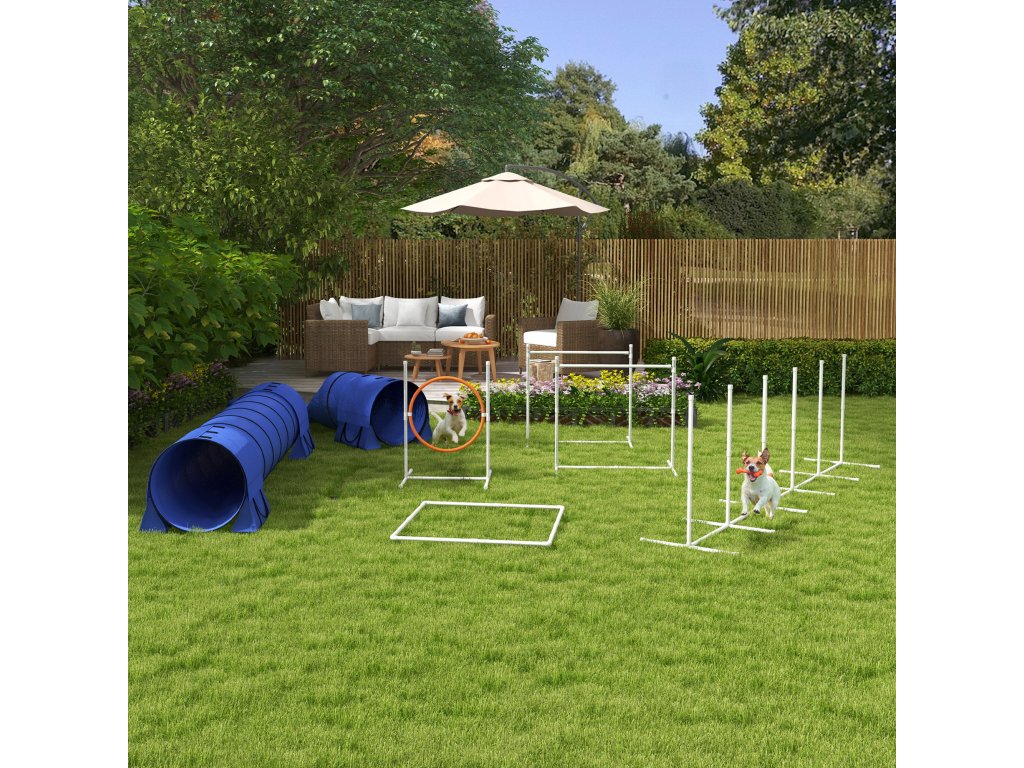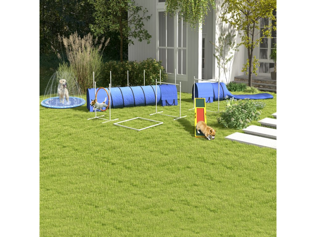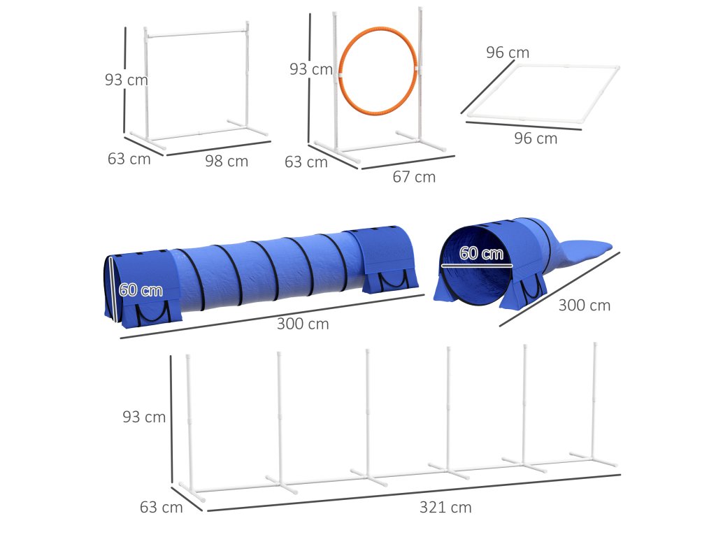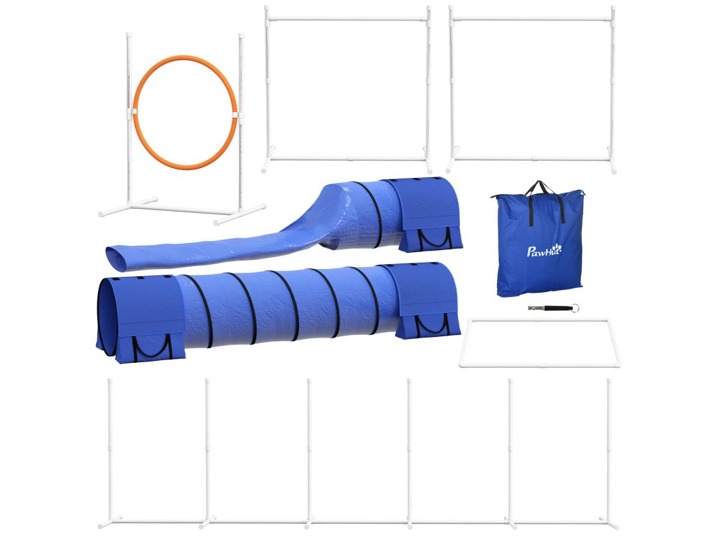 PawHut agility set pro psy, 1 pneumatika, 2 tunely 2 překážky, 321 cm x 63c m x 93 cm, modrá + červená + bílá