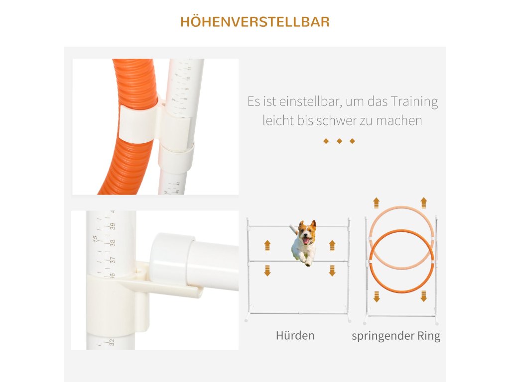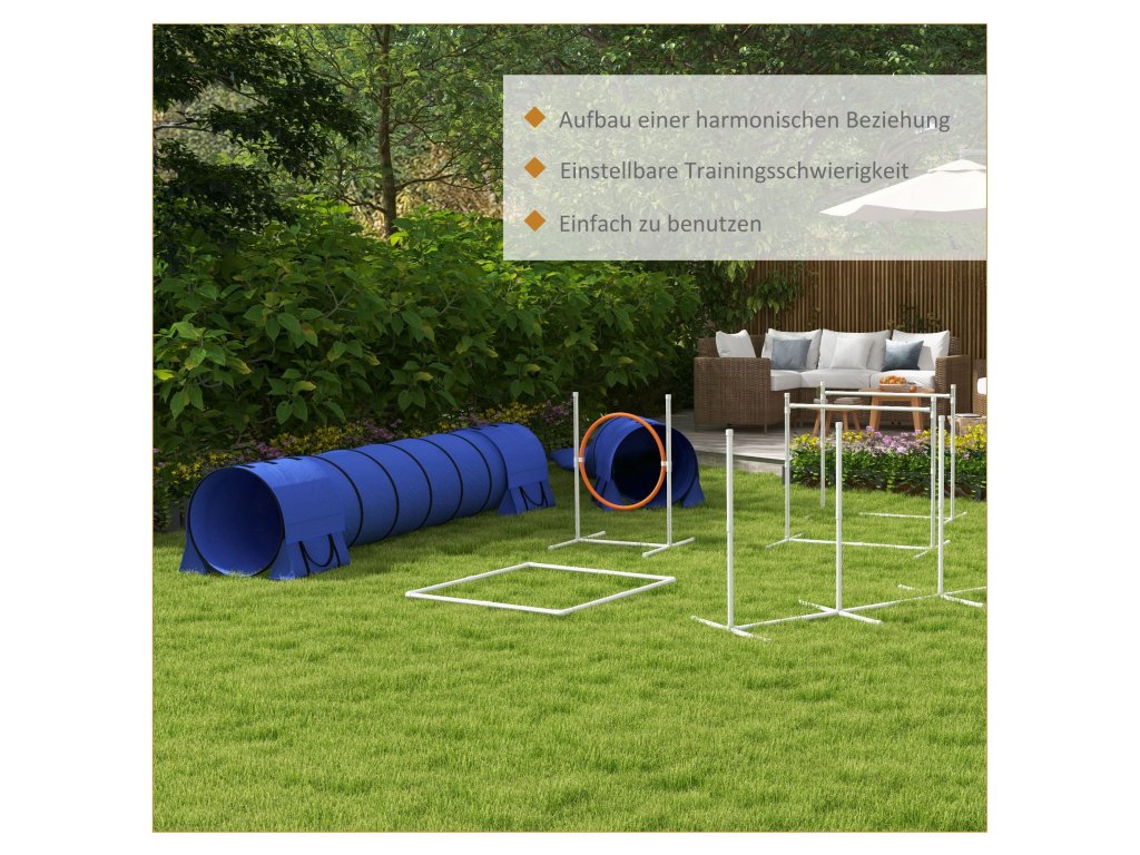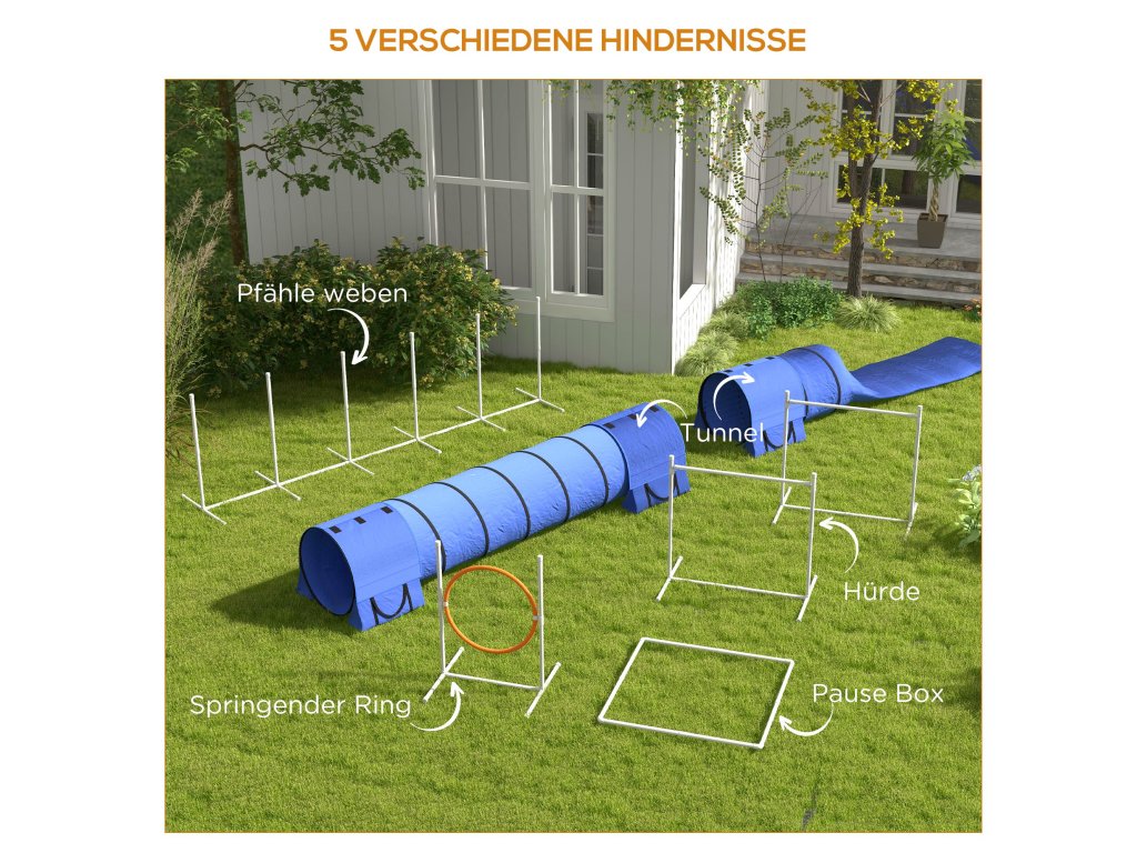 - Kompletní sada agility pro psy: Naše agility hřiště pro psy je 7dílná sada se slalomovými tyčemi, přerážecím boxem, dvěma nastavitelnými překážkami, nastavitelným skákacím kruhem a dvěma tunely. Díky tomu můžete svého psa trénovat komplexně. Všechny důležité součásti jsou obsaženy v jedné sadě