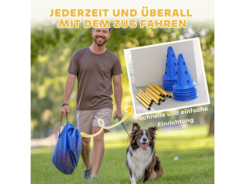 Snadné nastavení: Není potřeba žádné nářadí! Agility set lze sestavit a rozložit během několika sekund. Lehké tyče a kužely jsou uloženy v přiloženém oxfordském vaku, což usnadňuje skladování a přepravu.