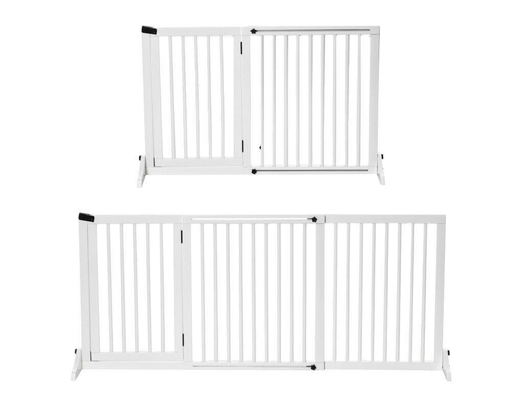 PawHut Bariérová mřížka pro psy Ochranná mřížka na dveře Dřevěná ochranná mřížka Volně stojící mřížka pro psy s dveřmi Bariérová mřížka pro psy Konfigurační mřížka pro krb a kamna Bílá 113-166 x 36 x 71 cm