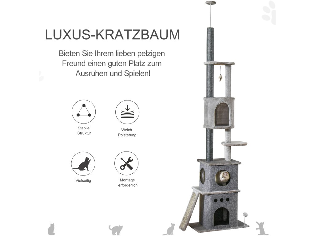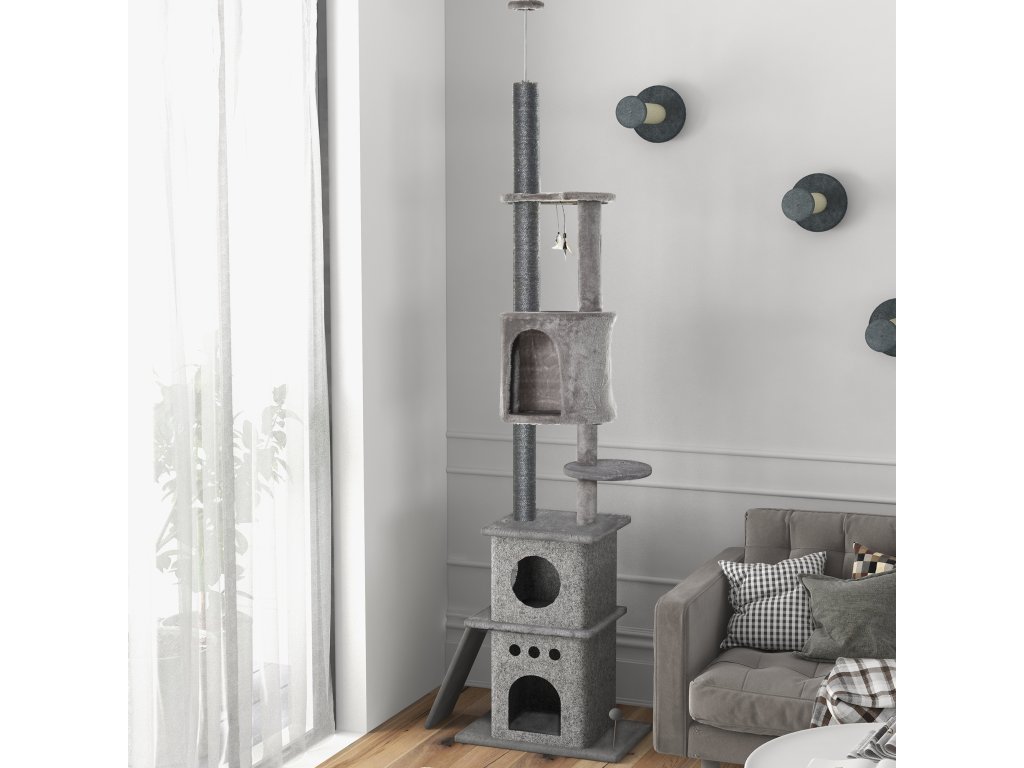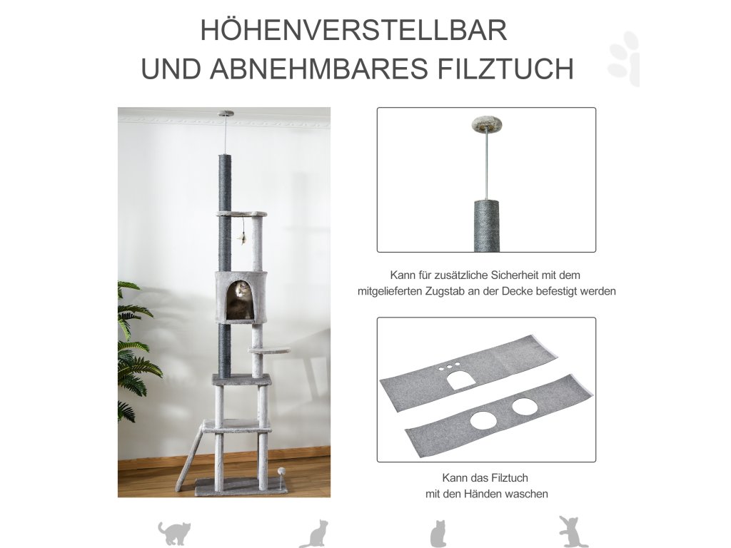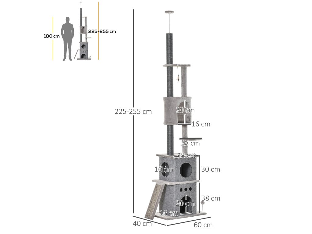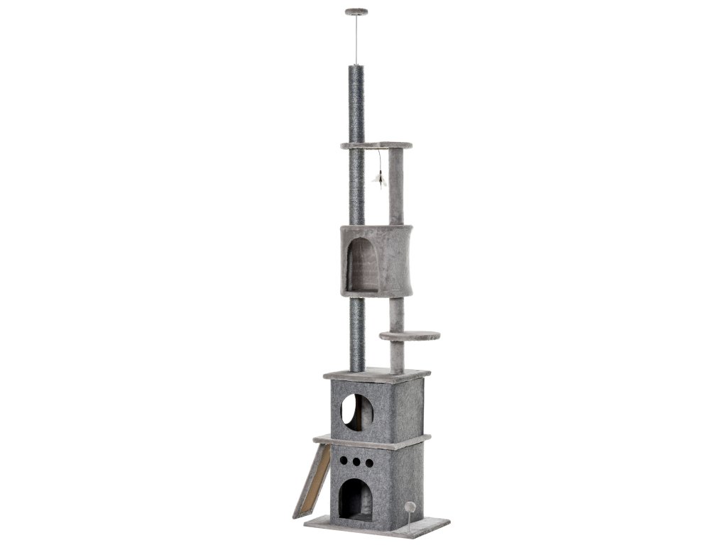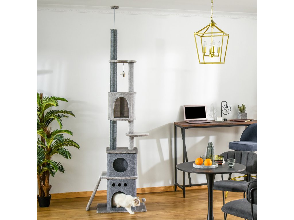 PawHut Cat Tree Strom pro kočky Stropní vysoký prolézací strom s hračkou pro kočky sisalový plyš světle šedý výškově nastavitelný 60 x 40 x 225-255 cm