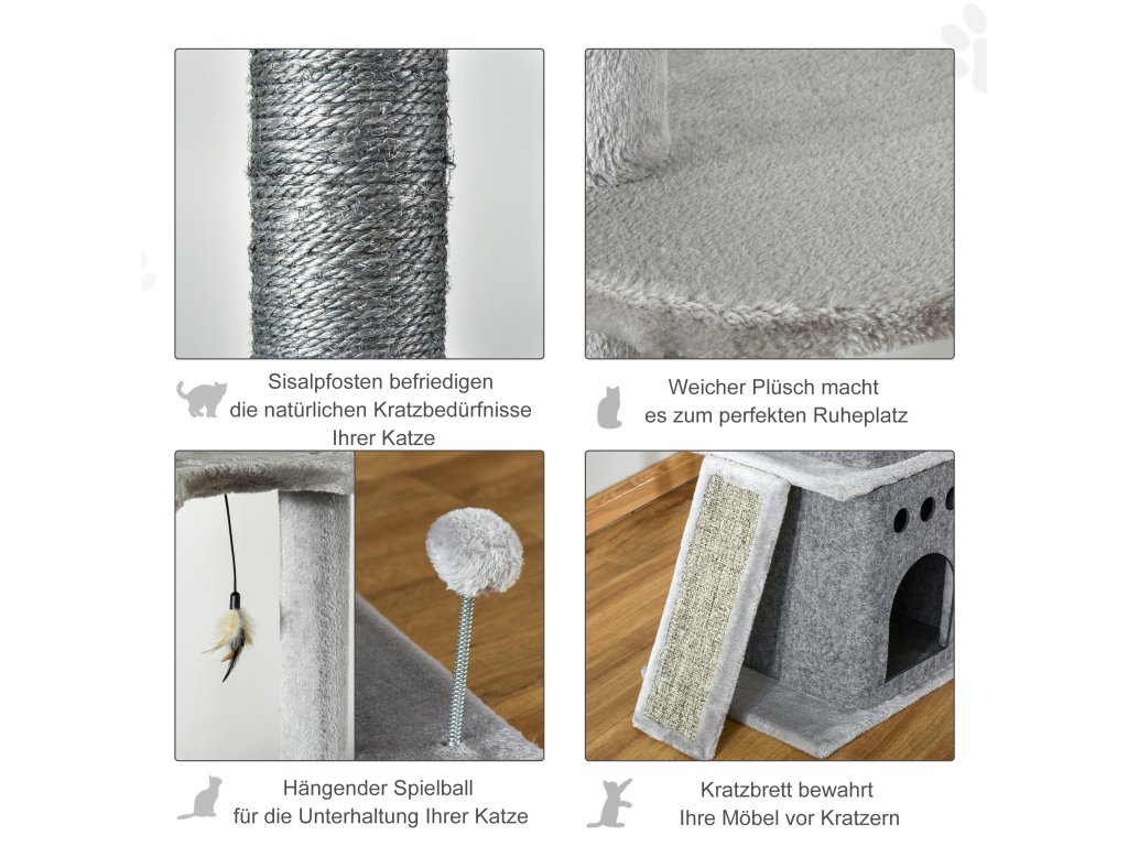 Toto škrabadlo od společnosti PawHut je spací plocha, dětské hřiště a škrabadlo v jednom. Vaše kočka může skotačit, hrát si a odpočívat na 5 úrovních. Všechny plošiny a jeskyně jsou potaženy měkkým plyšem. Dva sloupky ze sisalového lana nabízejí vaší kočce možnost brousit si drápky. Vrchní plyšový materiál je snímatelný a pratelný. Toto škrabadlo od PawHut je ideálním domovem pro vaše kočky.