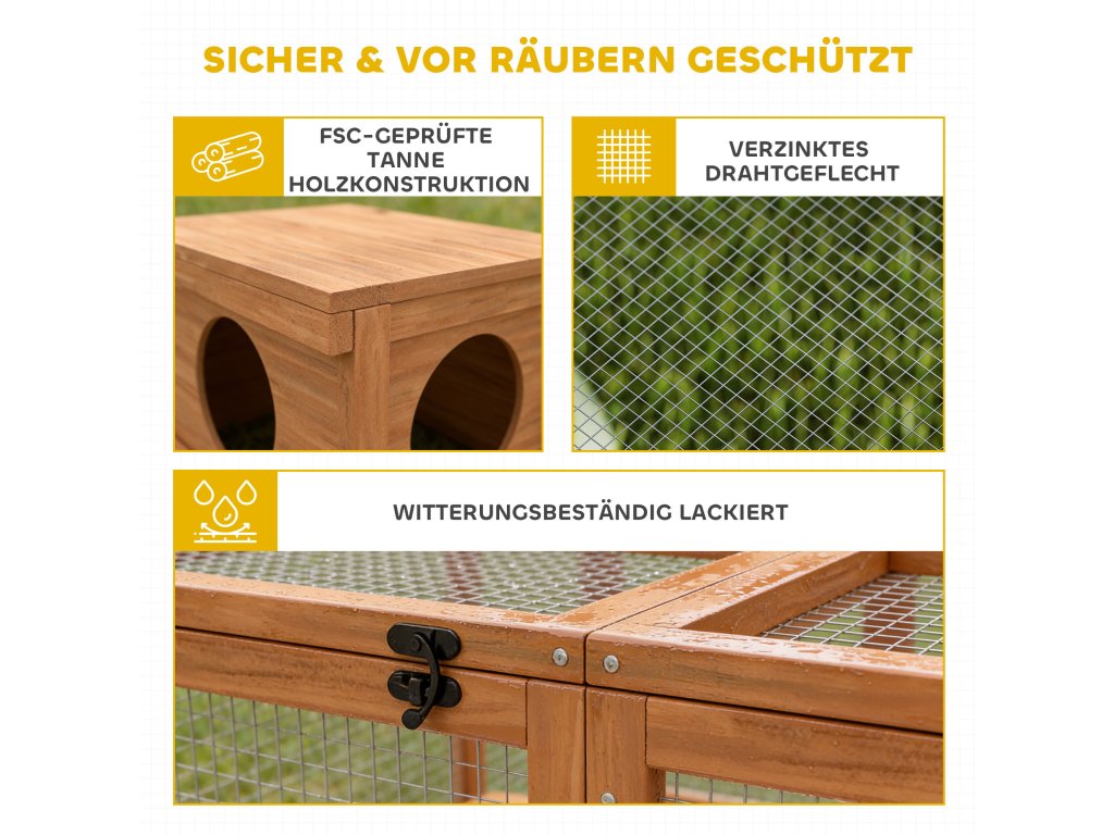 Bezpečné a odolné proti predátorům: Vyrobeno z robustního rámu z jedlového dřeva s certifikací FSC a odolného drátěného pletiva 12 x 12 mm, které zabraňuje útěku. Robustní zámky poskytují spolehlivou ochranu před predátory, takže se můžete uvolnit s vědomím, že vaši mazlíčci jsou v bezpečí.
