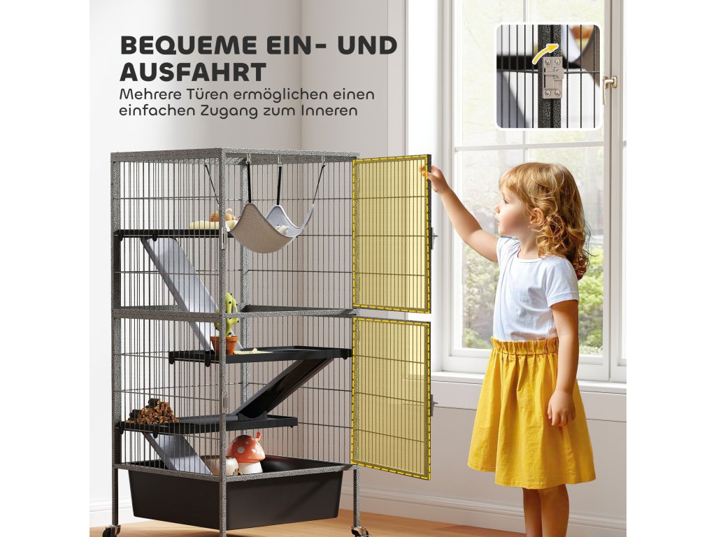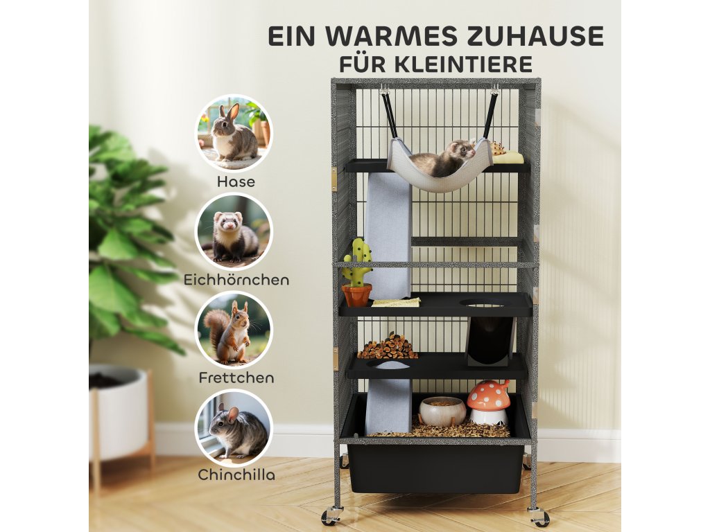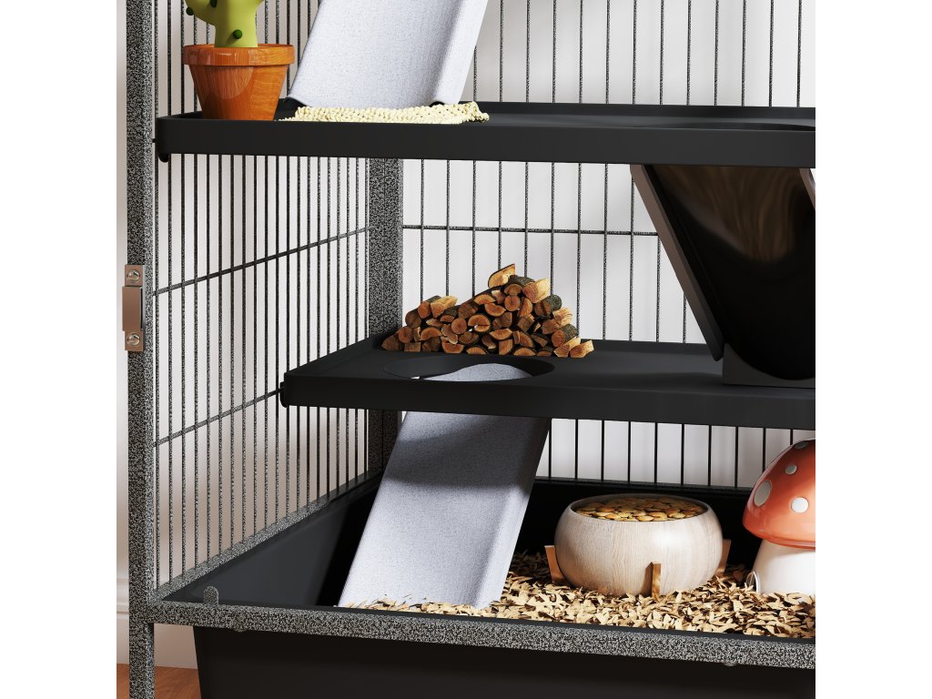 Výbava vhodná pro domácí mazlíčky: Díky třem plošinám a protiskluzovým rampám s látkovým potahem poskytuje tato vnitřní klec pro malá zvířata optimální pohodlí a bezpečnost pro citlivé tlapky vašeho mazlíčka.