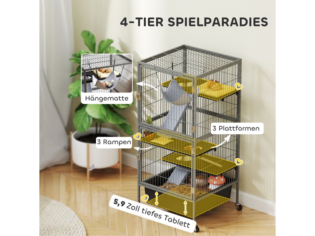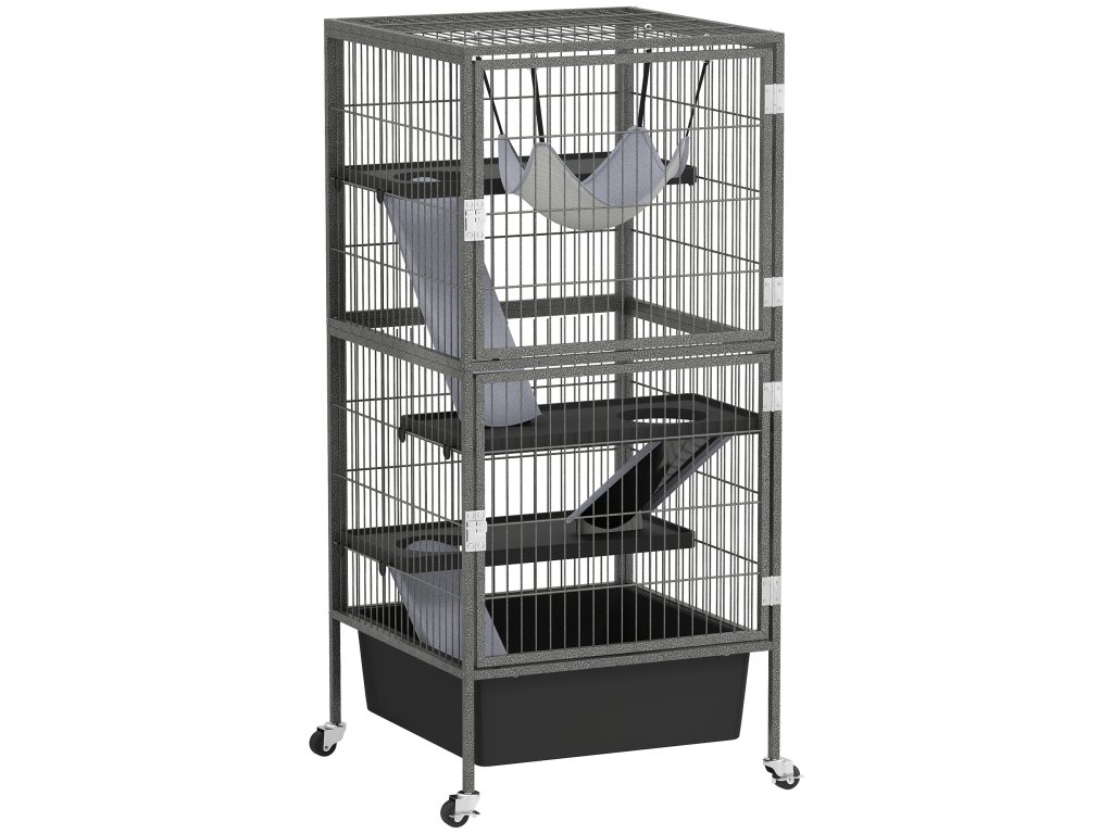 PawHut klec pro malá zvířata, 4patrová klec pro hlodavce s výsuvným podnosem, rampy, houpací sítí, kolečky, plošinami, 52x52x115 cm, šedá