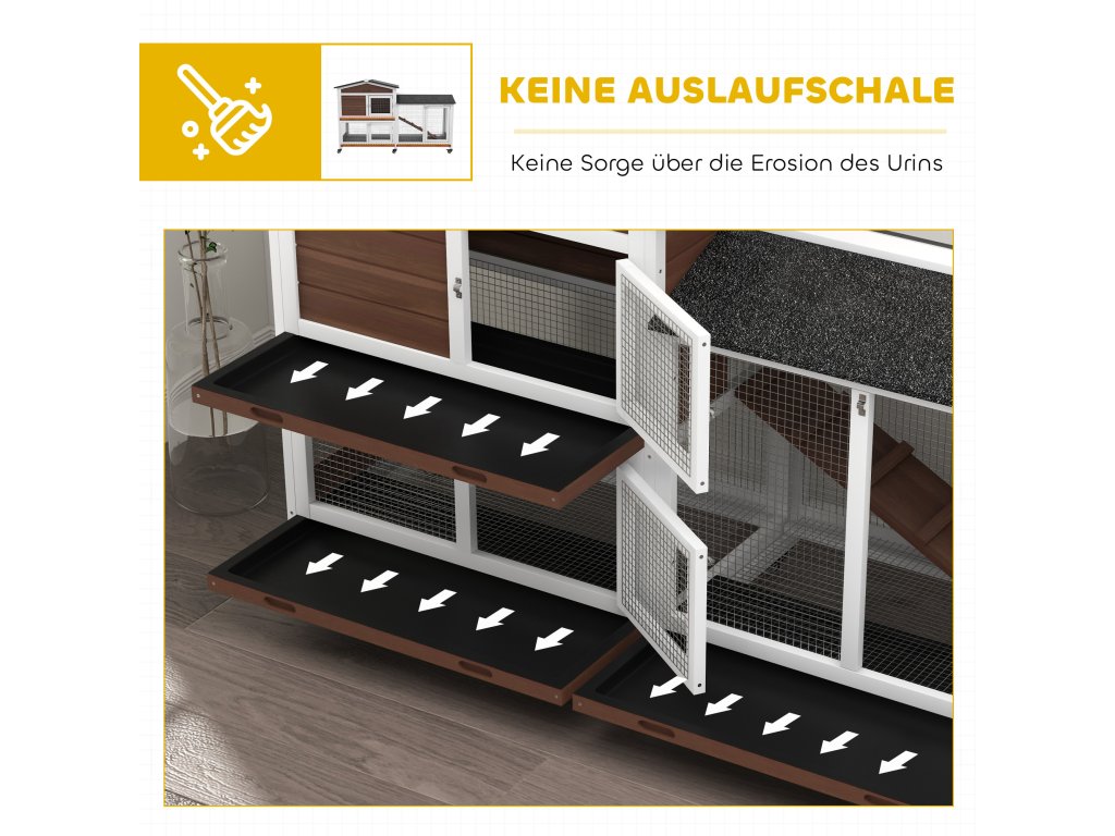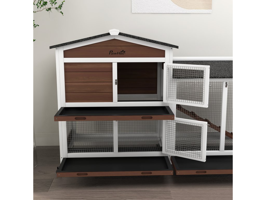 Tato venkovní králíkárna pro malá zvířata od PawHut je ideální pro zakrslé králíky, morčata a další podobně velká zvířata. Tato luxusní dřevěná králíkárna pro zakrslé králíky nabízí kombinaci bezpečí a svobody. Horní patro je navrženo pro soukromí a odpočinek, zatímco spodní patro poskytuje více prostoru pro cvičení a hraní. Dopřejte svému chlupatému kamarádovi pohodlný domov od PawHut!