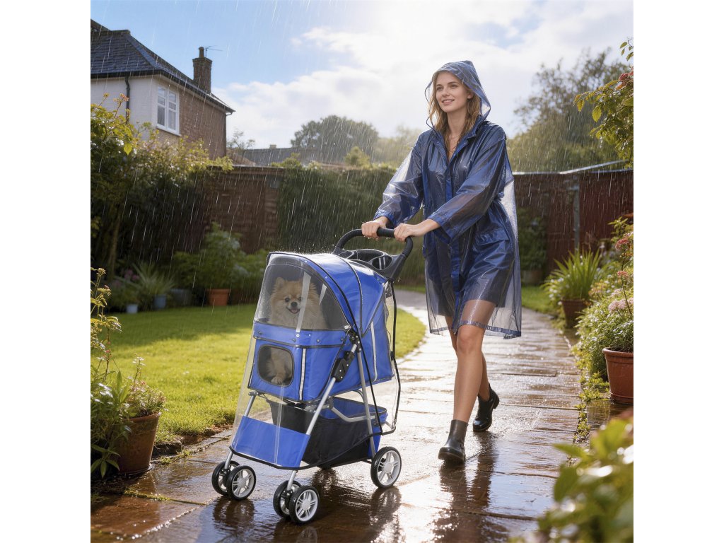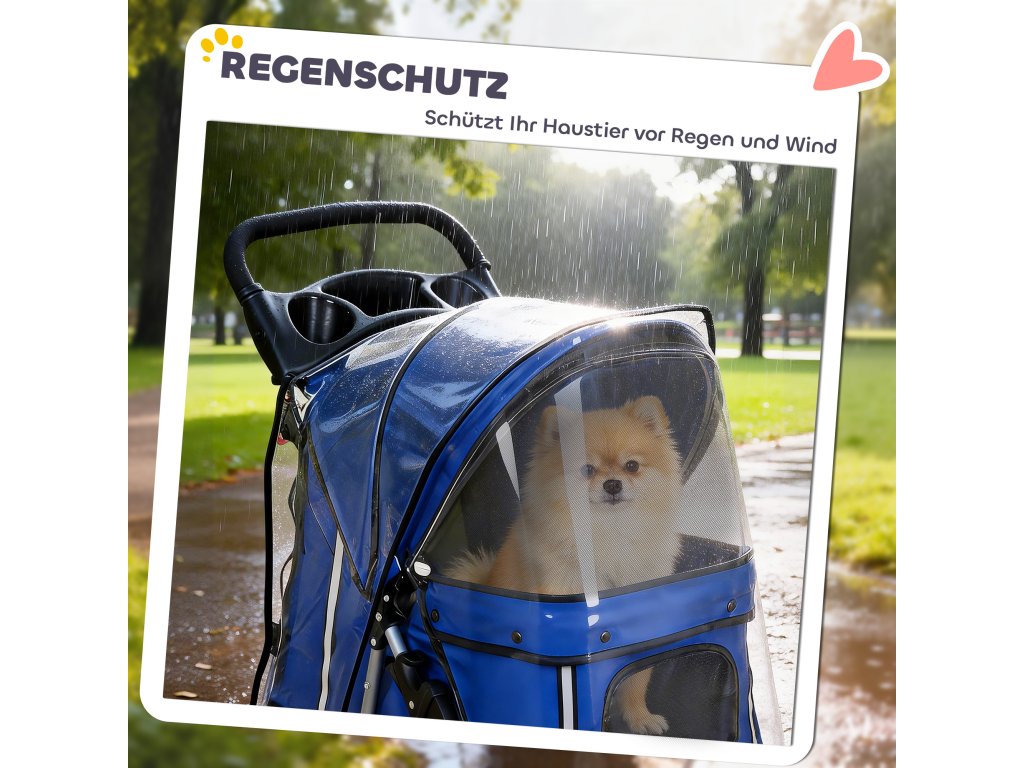 Promyšlený design: Pohodlná rukojeť s integrovaným držákem na nápoje a prostorný spodní košík nabízejí dostatek místa na nápoje a pamlsky. Viditelné pásky zajišťují bezpečnost vašeho mazlíčka za zhoršených světelných podmínek a odnímatelná pláštěnka umožňuje pohodlné procházky i v deštivém počasí.