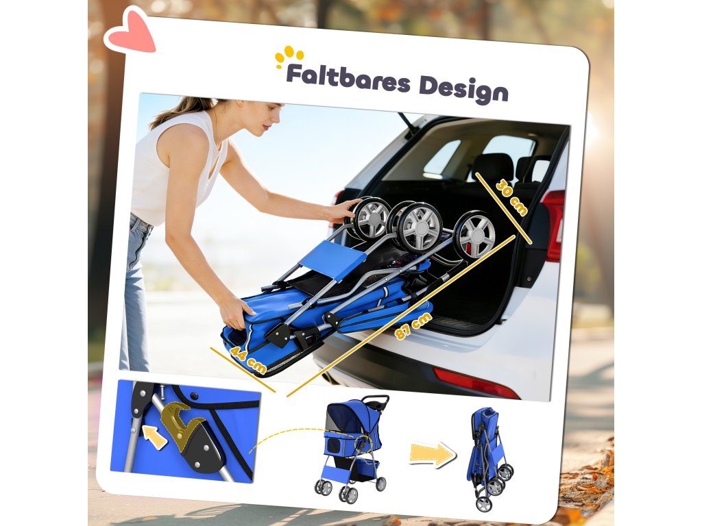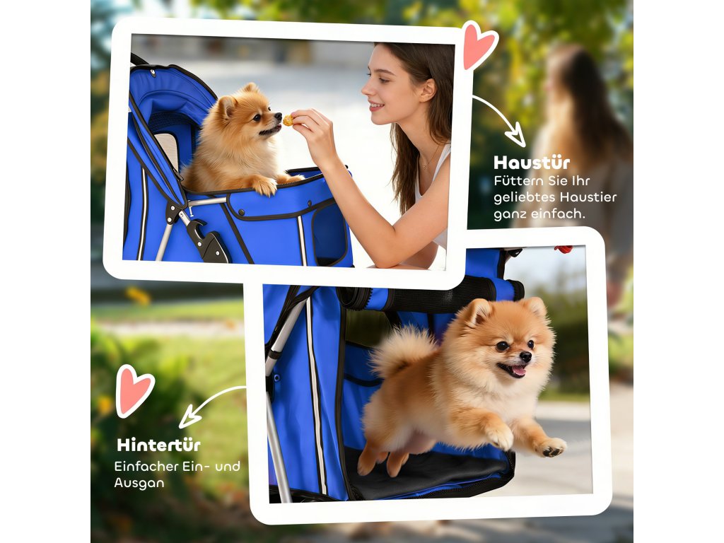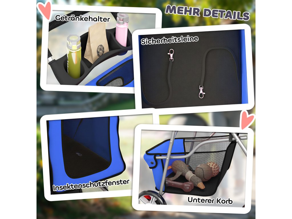 Bezpečný design: Přední univerzální kola a zadní směrová kola s brzdovými páčkami usnadňují parkování, zatímco vnitřní bezpečnostní vodítko drží vašeho mazlíčka bezpečně připoutaného. Dva páry reflexních proužků vpředu a vzadu zvyšují viditelnost a bezpečnost.