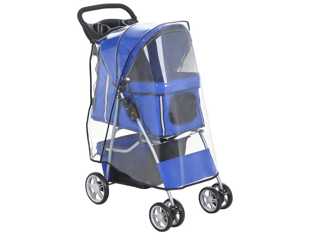 PawHut kočárek pro psy, skládací kočárek pro psy, kočárek pro kočky do 10 kg s pláštěnkou, reflexní proužky, úložný koš, 77x44x102cm, modrý