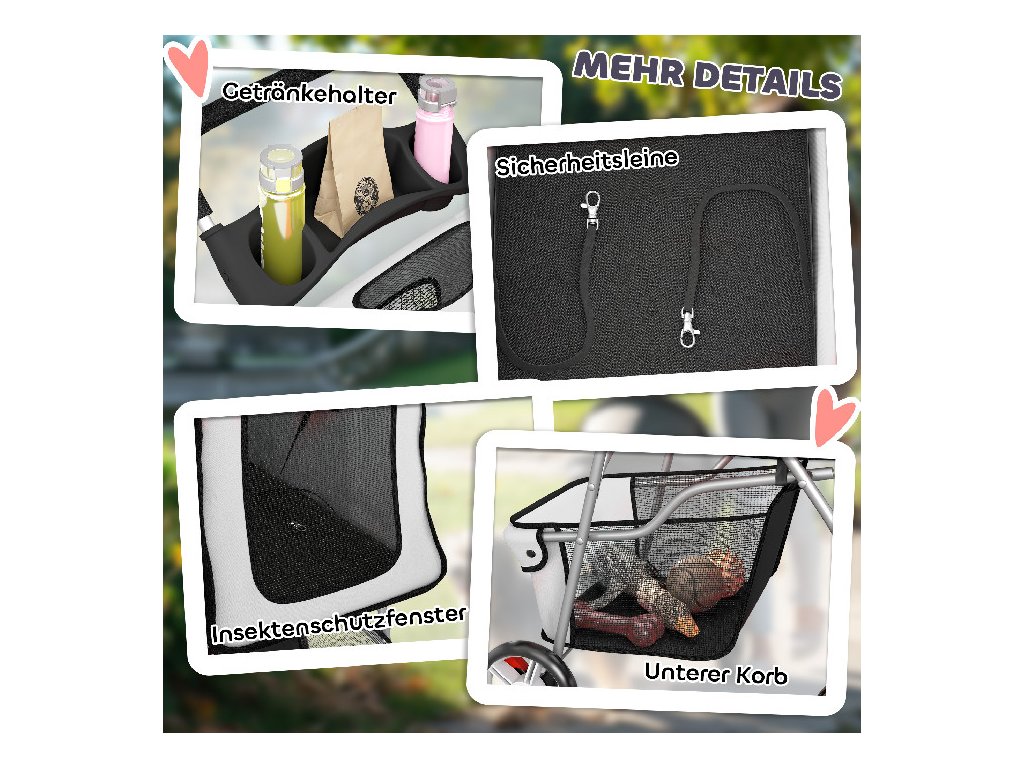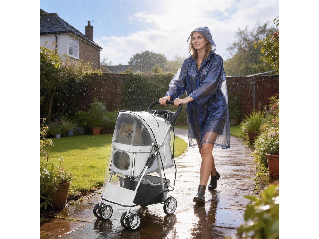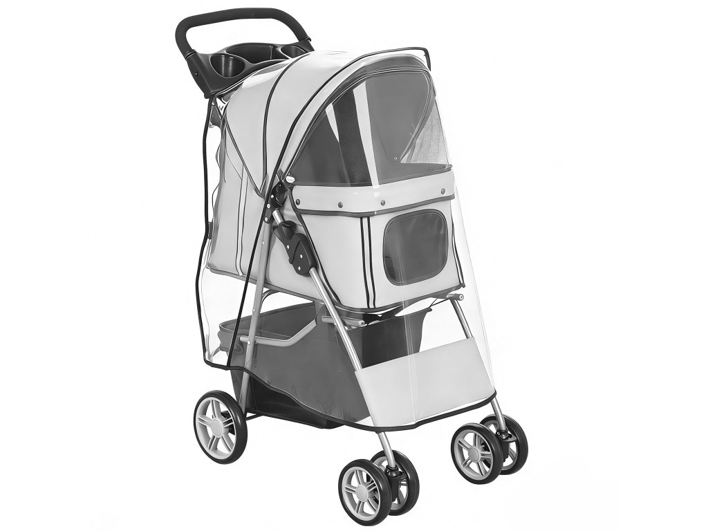 Promyšlený design: Pohodlná rukojeť s integrovaným držákem na nápoje a prostorný spodní košík nabízejí dostatek místa na nápoje a pamlsky. Viditelné pásky zajišťují bezpečnost vašeho mazlíčka za zhoršených světelných podmínek a odnímatelná pláštěnka umožňuje pohodlné procházky i v deštivém počasí.