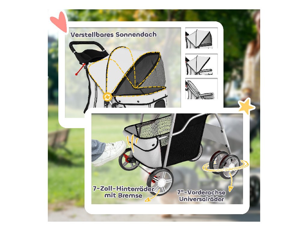 Bezpečný design: Přední univerzální kola a zadní směrová kola s brzdovými páčkami usnadňují parkování, zatímco vnitřní bezpečnostní vodítko drží vašeho mazlíčka bezpečně připoutaného. Dva páry reflexních proužků vpředu a vzadu zvyšují viditelnost a bezpečnost.