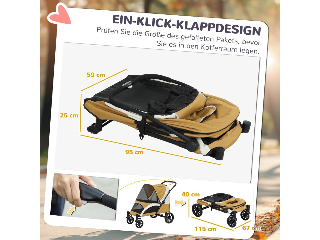- ✔ Skládací konstrukce kočárku pro psy na jedno kliknutí usnadňuje skladování a přepravu