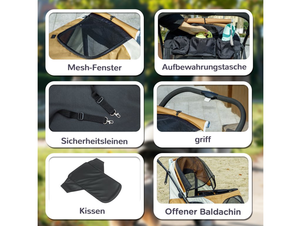 - Hladké klouzání: Kočárek pro kočky: díky hladce jedoucím kolům, rámu tlumícímu nárazy a účinné nožní brzdě poskytuje tichou a bezproblémovou jízdu. Váš pes se může kochat výhledem, aniž by mu zábavu kazily hrbolaté koleje