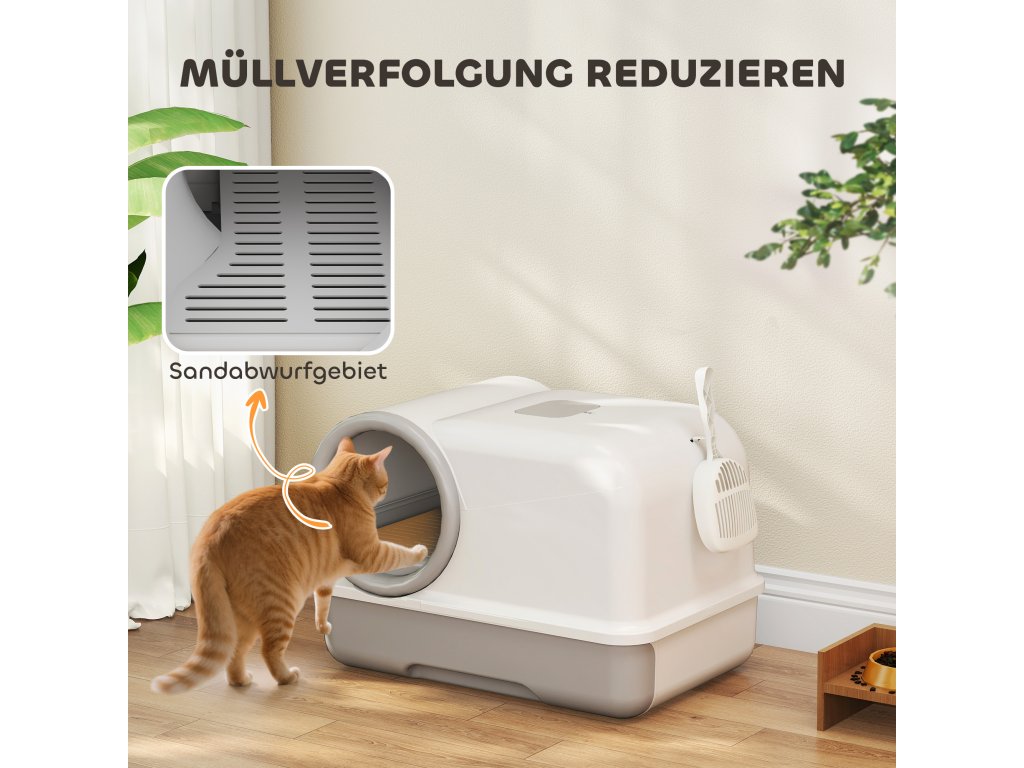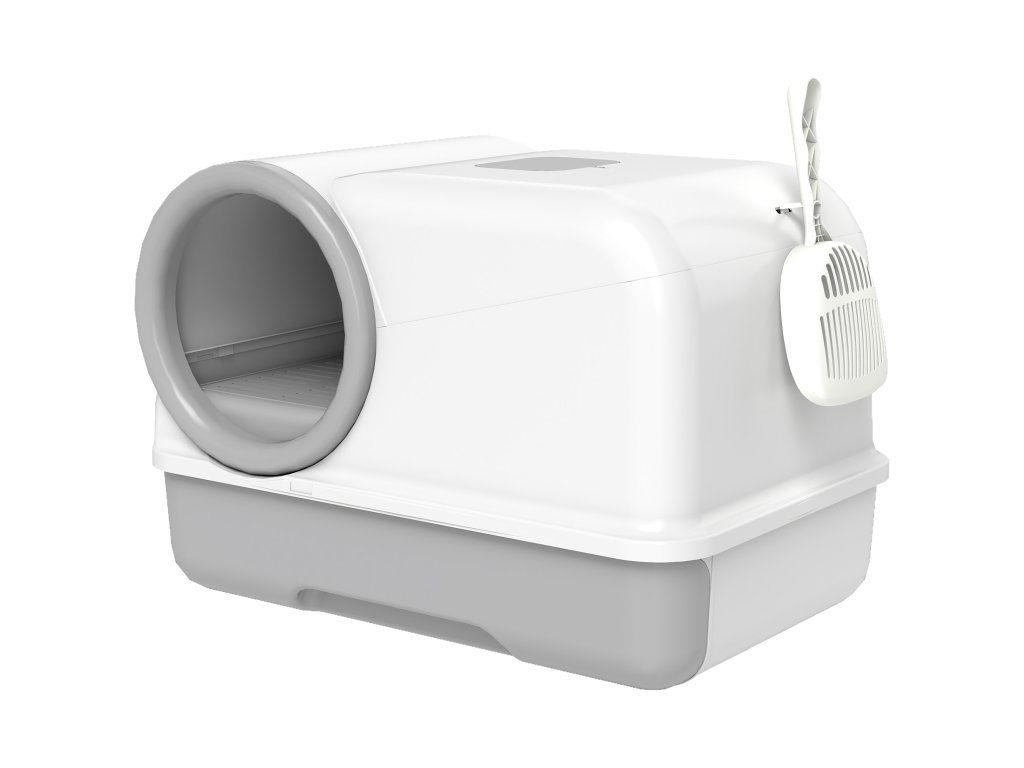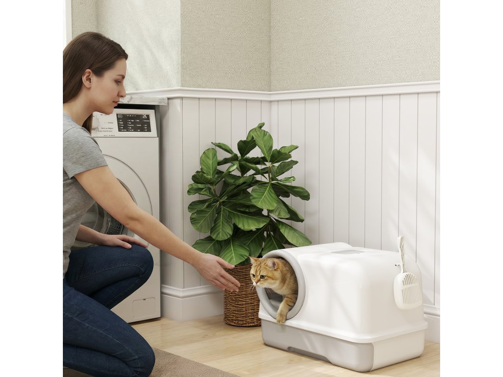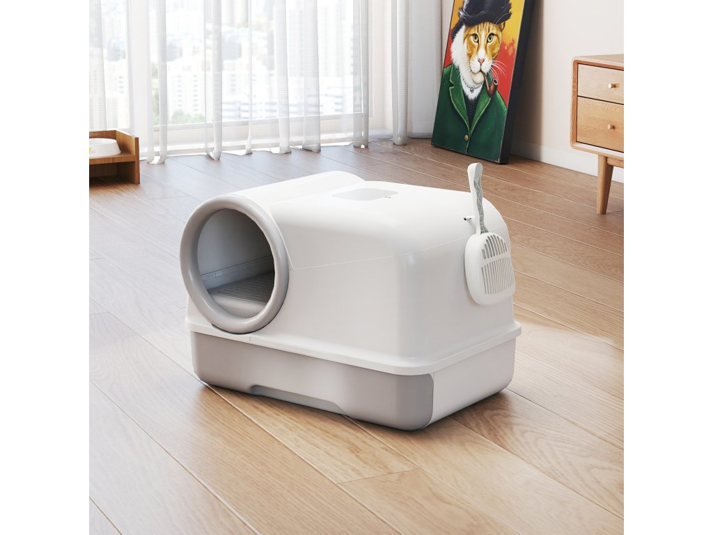 PawHut kočičí toaleta s víkem, naběračkou, výsuvnou miskou, 2 filtry s aktivním uhlím pro kočky do 5 kg, 59x39,5x39,5 cm, bílá+šedá