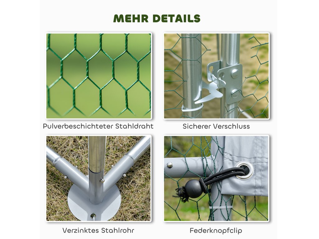 Odolná konstrukce: Robustní venkovní výběh je vyroben z pozinkovaných ocelových trubek a ocelového pletiva s plastovým potahem, které spolehlivě chrání vaše kuřata a odolává každodennímu používání i nepříznivým vlivům.
