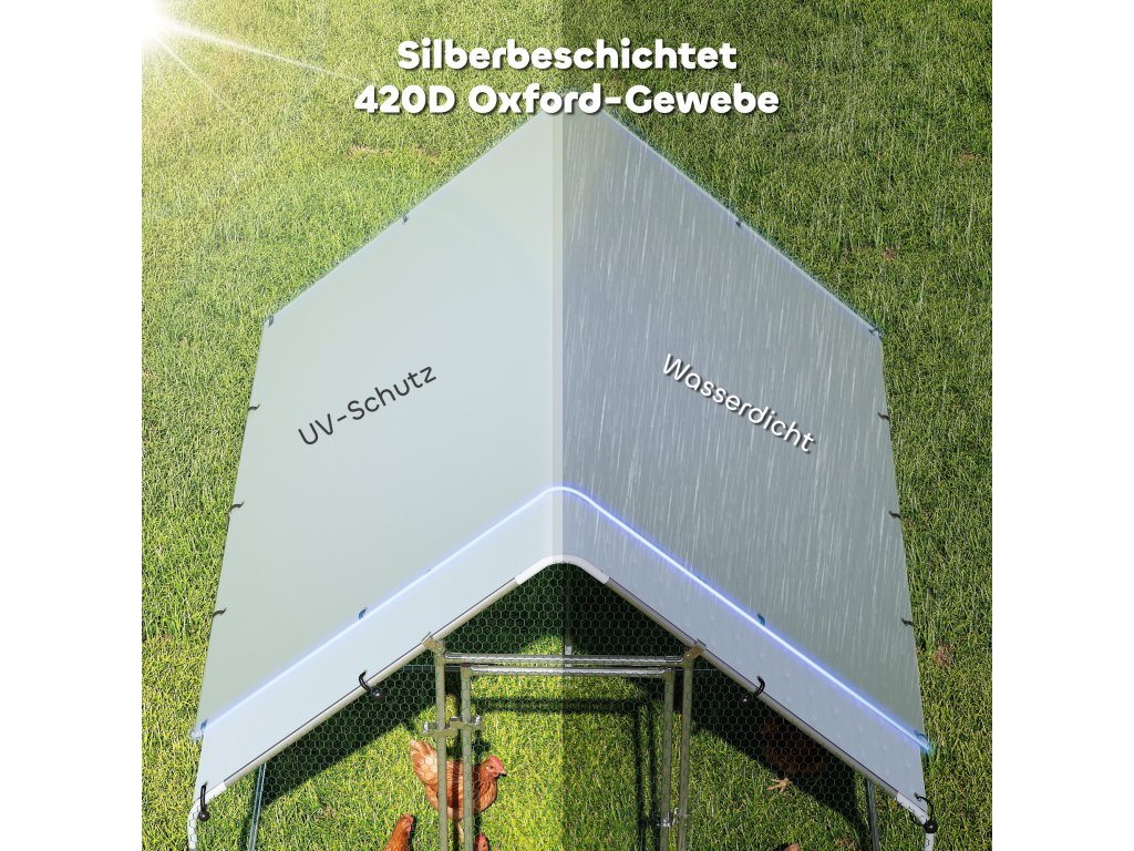 Vodotěsný kryt: Odolný polyester 420D Oxford se stříbrně potaženou střechou poskytuje optimální ochranu před UV zářením a udržuje vaše kuřata v suchu, bezpečí a pohodlí po celý rok.