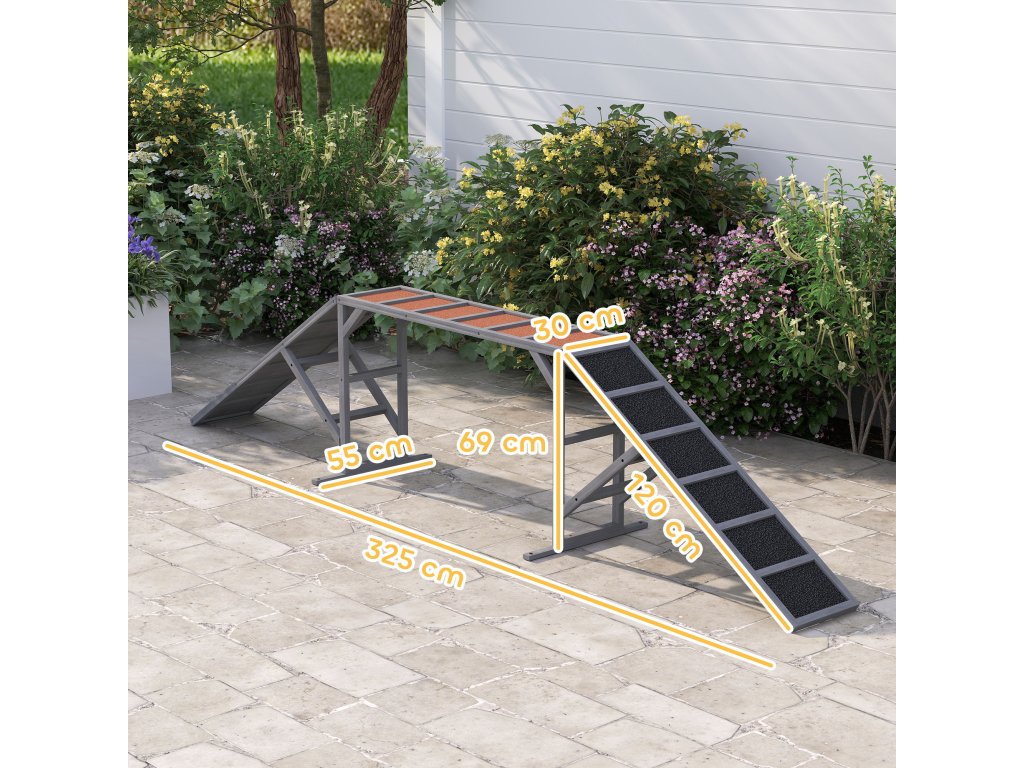 PawHut můstek pro psy s bezpečnostní madlem, protiskluzový povrch, odolný proti povětrnostním vlivům, agility vybavení pro psy do 40 kg, 325x55x69 cm, šedý