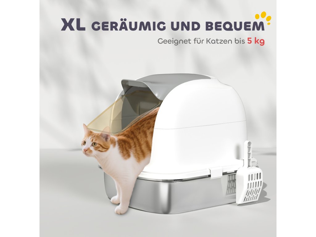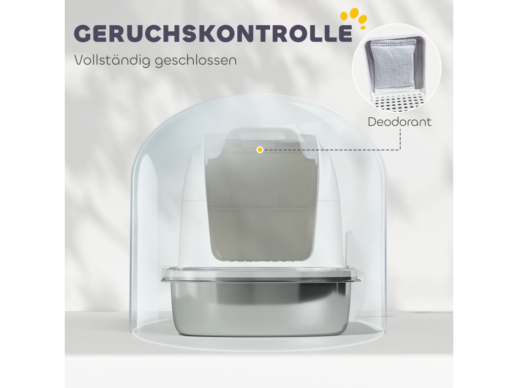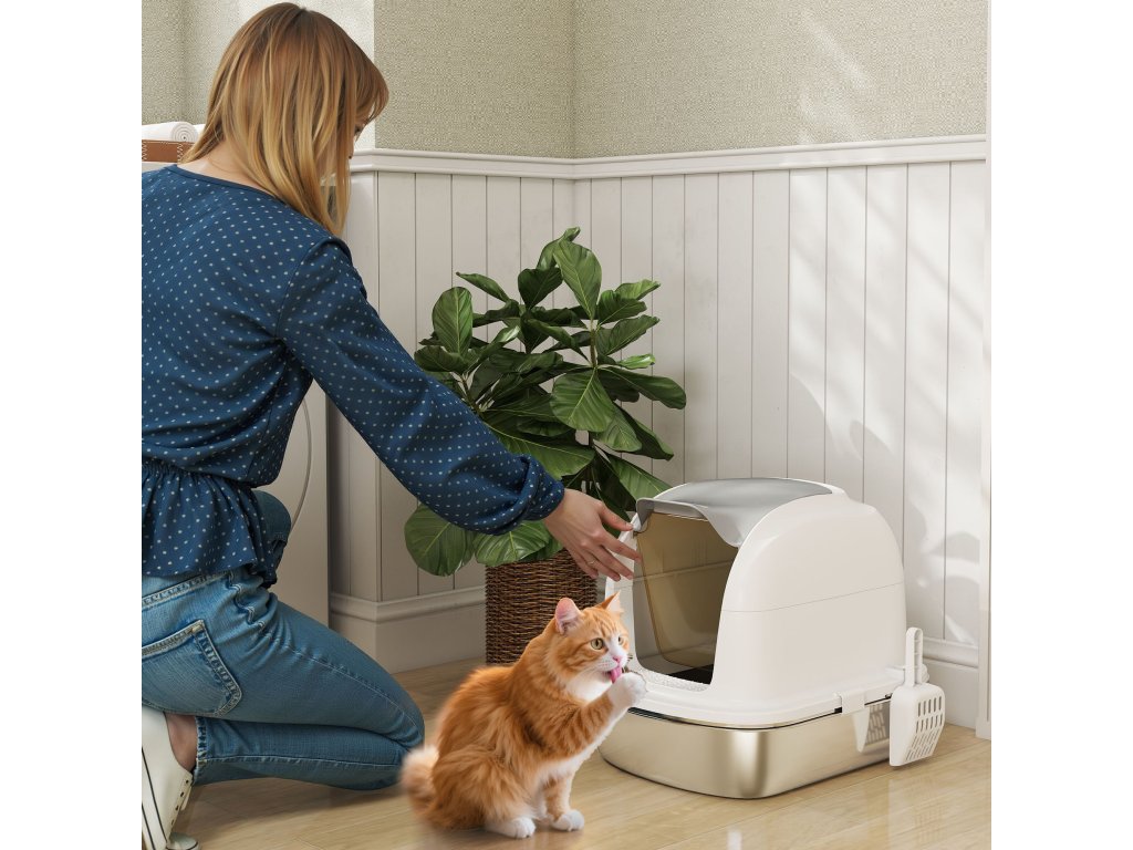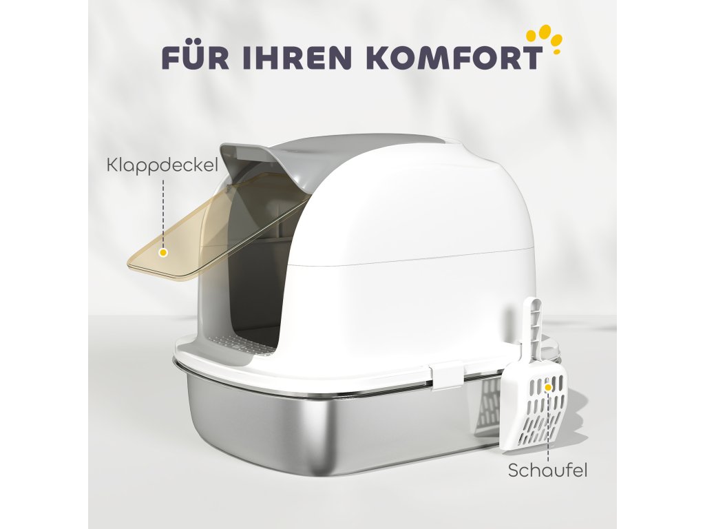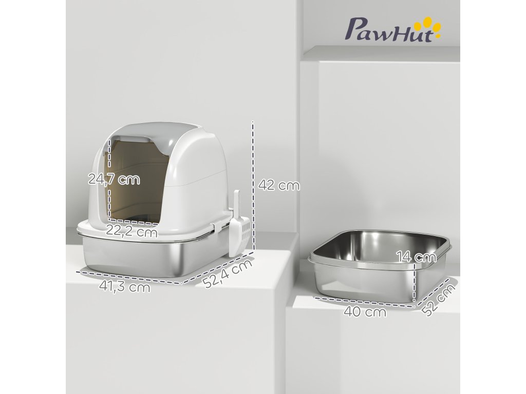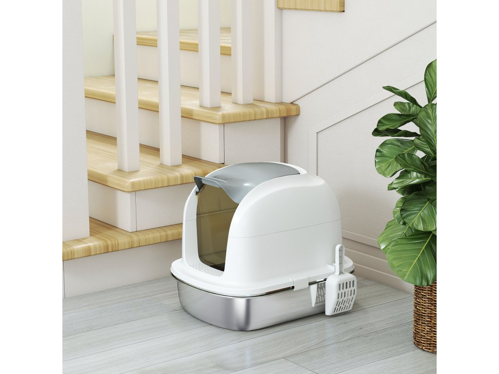 PawHut nerezová kočičí toaleta s víkem, kočičí toaleta s vaničkou, lopatka na toaletu, pro kočky do 5 kg, 52,4 x 41,3 x 42 cm, bílá
