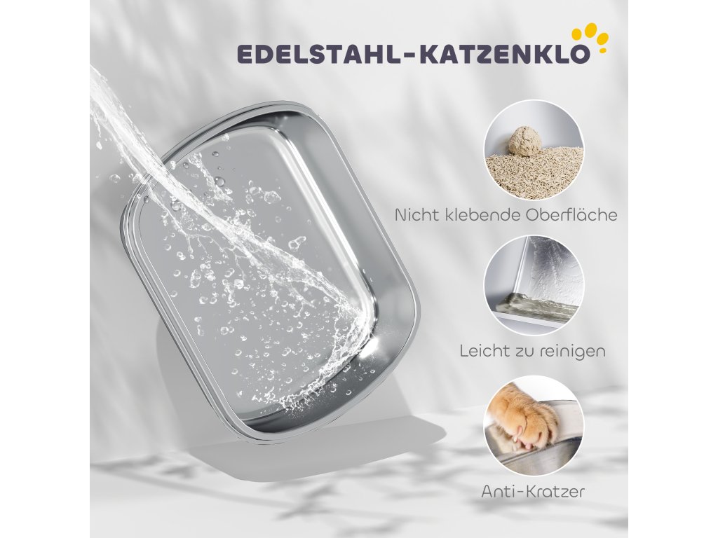 Nezbytný produkt pro majitele koček – nerezová toaleta PawHut nabízí dostatek prostoru, snadno se čistí a redukuje zápach. Hladký povrch se snadno otírá a uzavřený design zajišťuje soukromí a příjemnější domácí prostředí. Je vybavena praktickým výklopným víkem a naběračkou pro snadné čištění. Kompaktní a stylová – ideální do každé domácnosti.