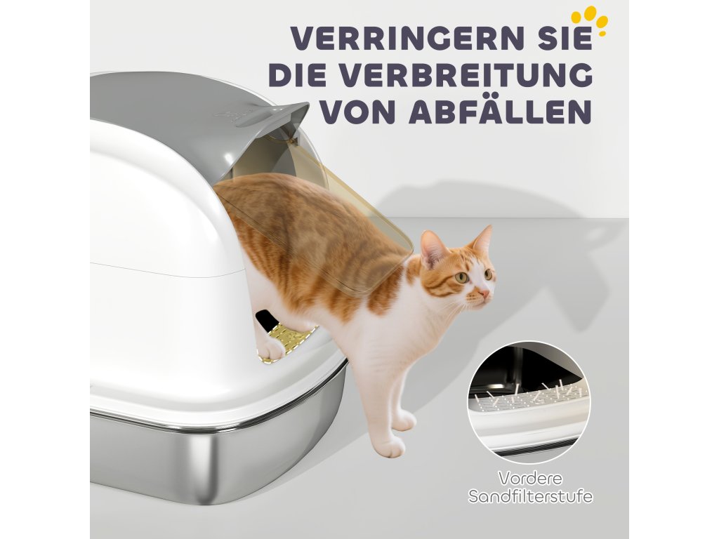✔ Přední vchod a pískový filtr zachycují stelivo z tlapek a zabraňují jeho rozptylu