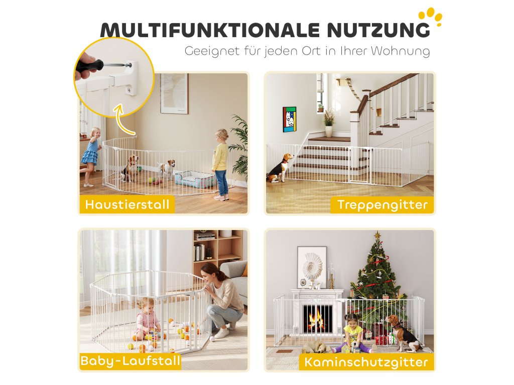 - Univerzální: Díky 8 panelům lze tento výběh pro štěňata přeměnit do různých tvarů, od osmiúhelníku přes čtverec až po tvar písmene L. Lze jej připevnit ke stěnám a použít jako schodišťovou bránu, protipožární zábranu nebo rozdělovač místností. Panely lze odebírat nebo přidávat v závislosti na dostupném prostoru