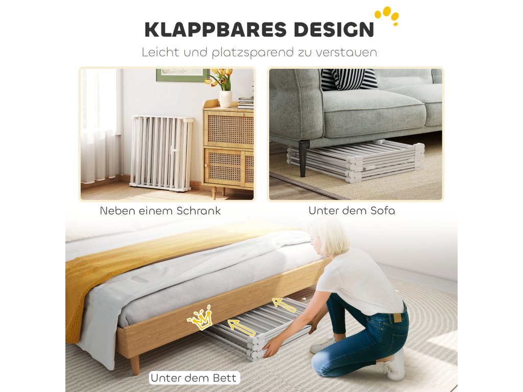 - Snadná instalace a skladování: Výběh pro štěňata je díky šroubovým spojům rychle připraven k použití a v době nepoužívání jej lze složit do kompaktního formátu. Jeho štíhlý design umožňuje diskrétní uložení pod pohovkou nebo postelí nebo podél stěny, abyste doma udrželi pořádek a organizaci