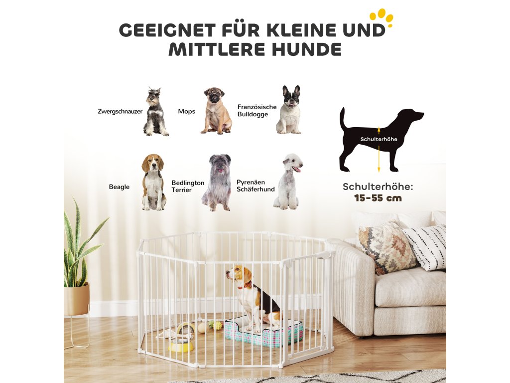 - Bezpečný pro děti a domácí zvířata: Díky výšce 75 cm, úzkým tyčím a zaobleným hranám tento výběh pro psy spolehlivě zabezpečí malé až středně velké psy (výška ramen 15-55 cm) a děti