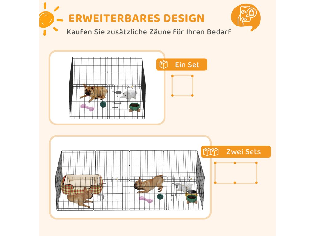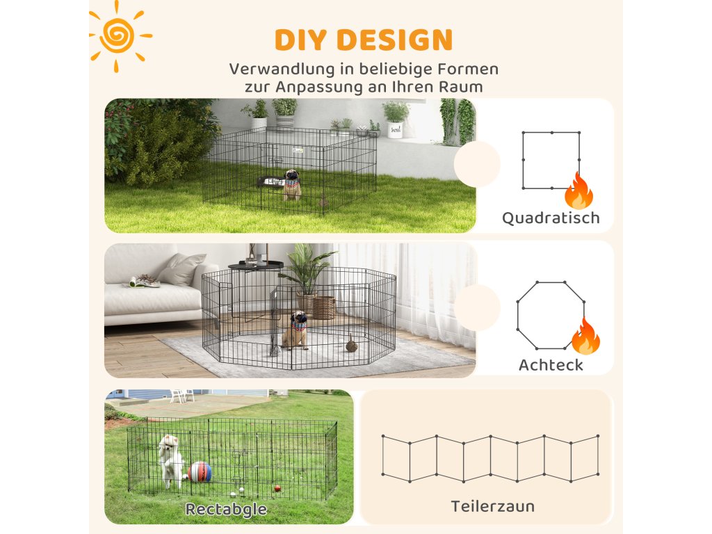 Ohrádka PawHut dělá hraní bezpečnějším pro malé domácí mazlíčky. Díky flexibilnímu designu ji lze konfigurovat do osmiúhelníku, čtverce nebo obdélníku, a přizpůsobit se tak jakékoli místnosti nebo zahradě. Pro ještě více prostoru ji lze snadno kombinovat s další jednotkou a vytvořit tak další hrací a relaxační plochy.