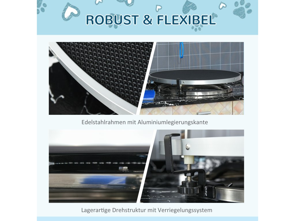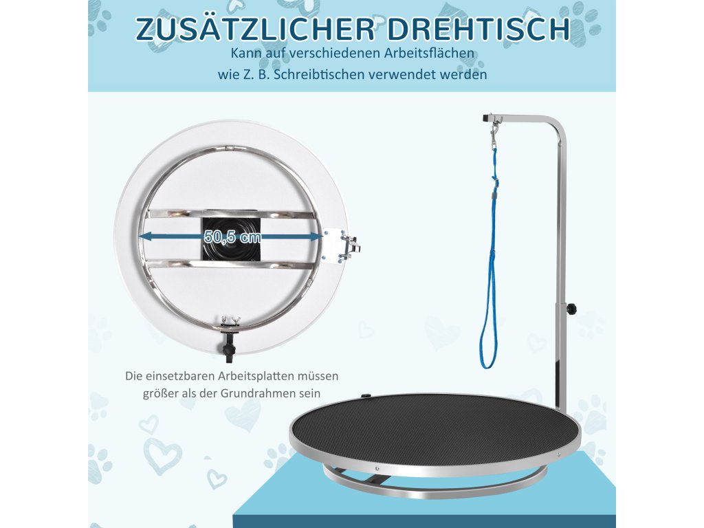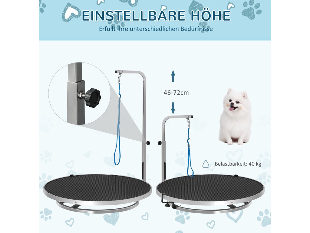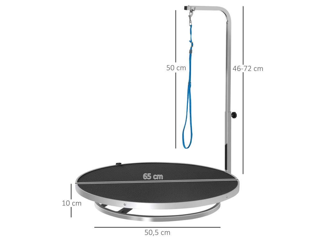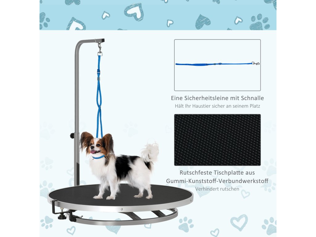 S tímto praktickým stolem na úpravu srsti od PawHut je úprava srsti vašeho psa hračka. Otočná deska stolu usnadňuje úpravu srsti a integrované bezpečnostní vodítko zajišťuje bezpečnost vašeho psa. Povrch stolu je protiskluzový, takže pes neklouže. Tento stůl na úpravu srsti od PawHut usnadňuje práci jak domácím, tak profesionálním psím kadeřníkům.