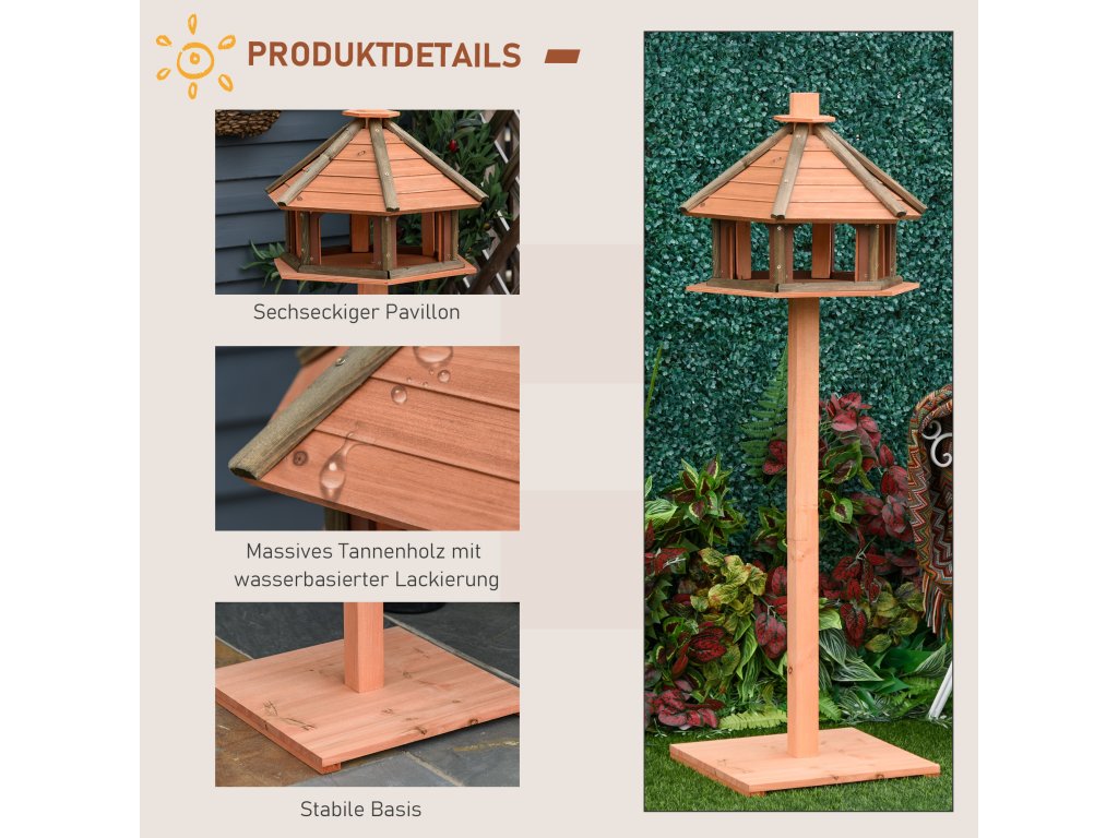 - Robustní a odolné vůči povětrnostním vlivům: Toto ptačí krmítko je vyrobeno z masivního rámu z jedlového dřeva a je robustní a odolné. Je natřena netoxickou barvou na vodní bázi a má sedlovou střechu, která odolává povětrnostním vlivům.