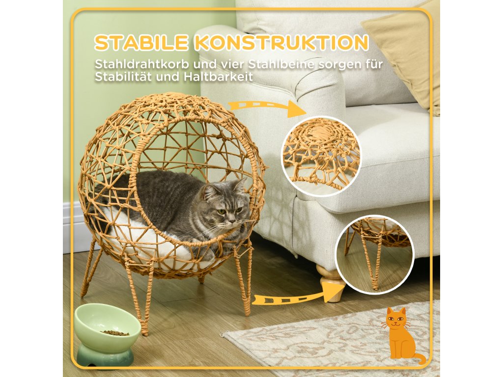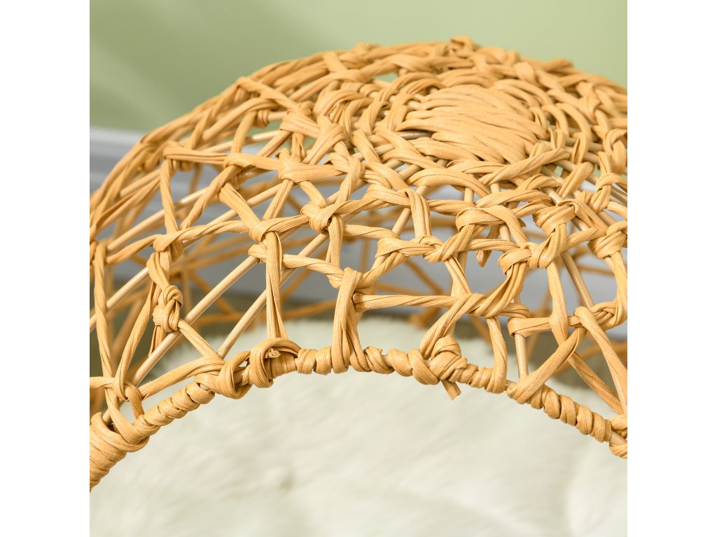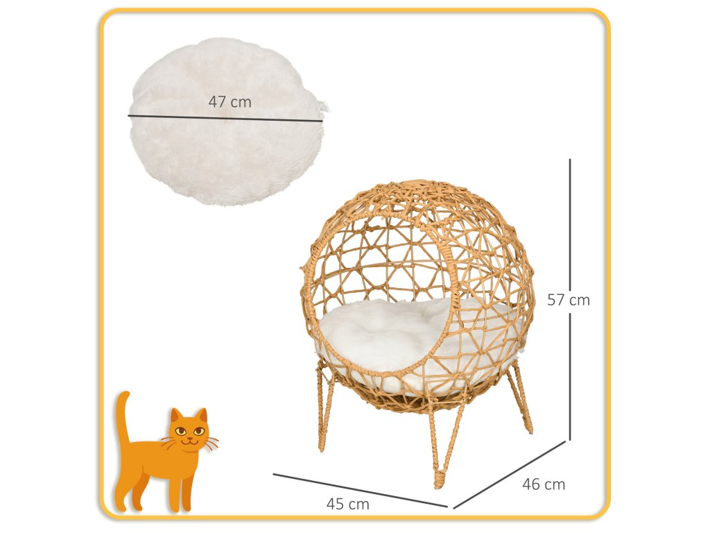 Dopřejte své kočce dokonalé místo, které bude moci nazývat svým vlastním, s tímto košem pro kočky od společnosti PawHut. Jeho velký a zaoblený design poskytuje vašemu mazlíčkovi dostatek místa uvnitř a velký polstrovaný polštář ve spodní části, vyrobený z polyesteru a směsi bavlny, poskytuje dostatek pohodlí. Rám je vyroben z tkané oceli a ratanu, s otvory po celém domečku a vyvýšenou konstrukcí, která umožňuje průchod vzduchu.