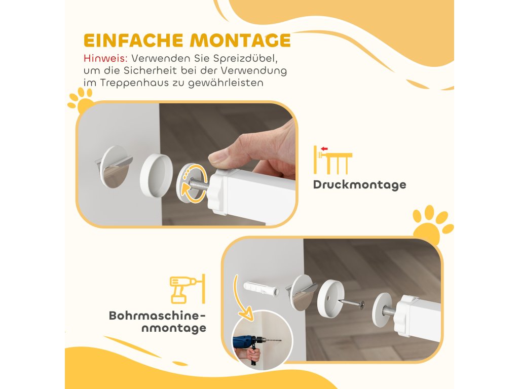 Rychlá instalace: Schodišťová branka se instaluje během několika minut bez vrtání díky tlakové montáži – bez poškození zdi, bez nutnosti použití nářadí. Šrouby jsou volitelné pro větší stabilitu. Ideální pro pronajímané byty, kuchyně a chodby.