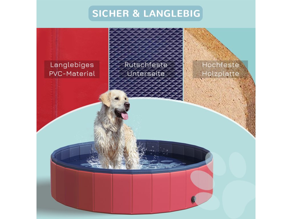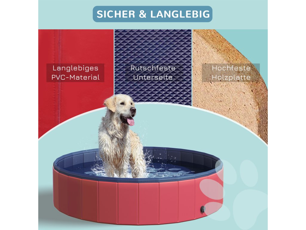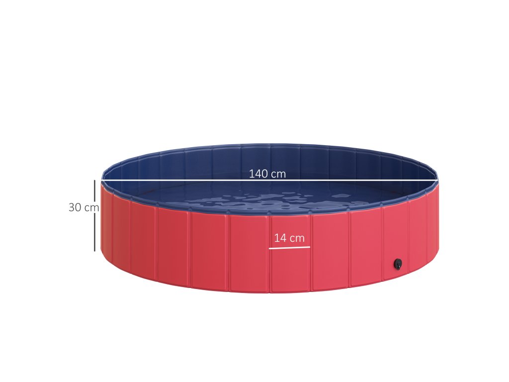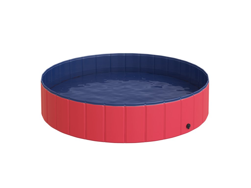 PawHut Skládací psí vanička, Psí bazén, Dětské brouzdaliště, Bazén pro psy a kočky, Plast + Dřevo, Červená, Ø140 x V30 cm