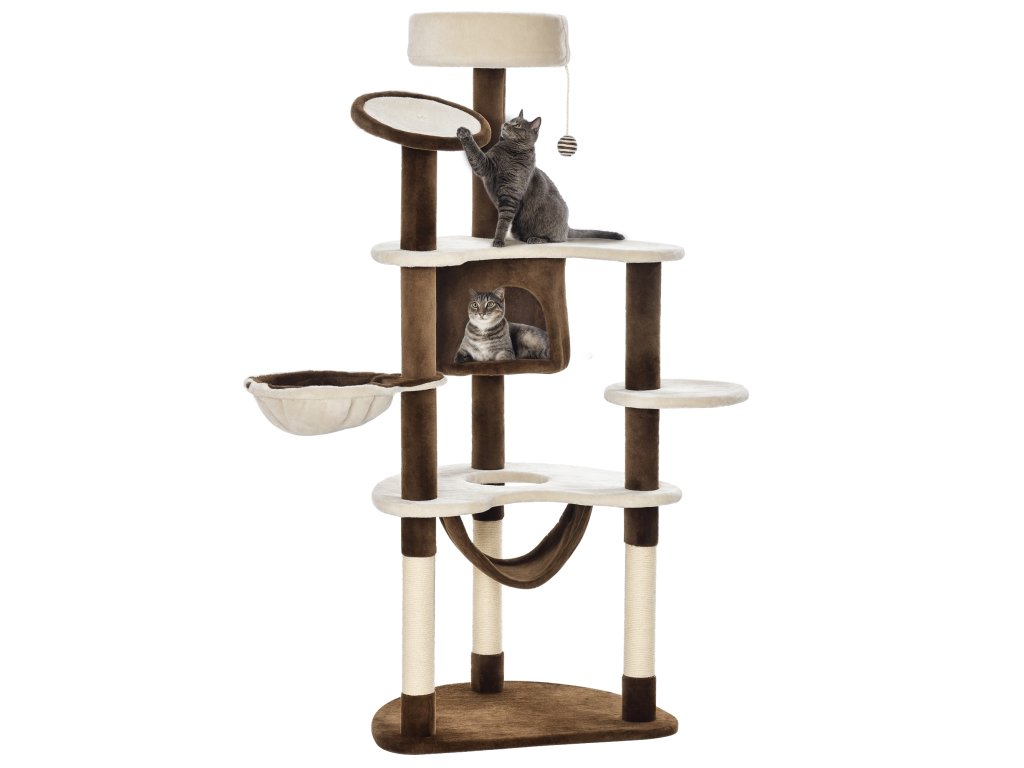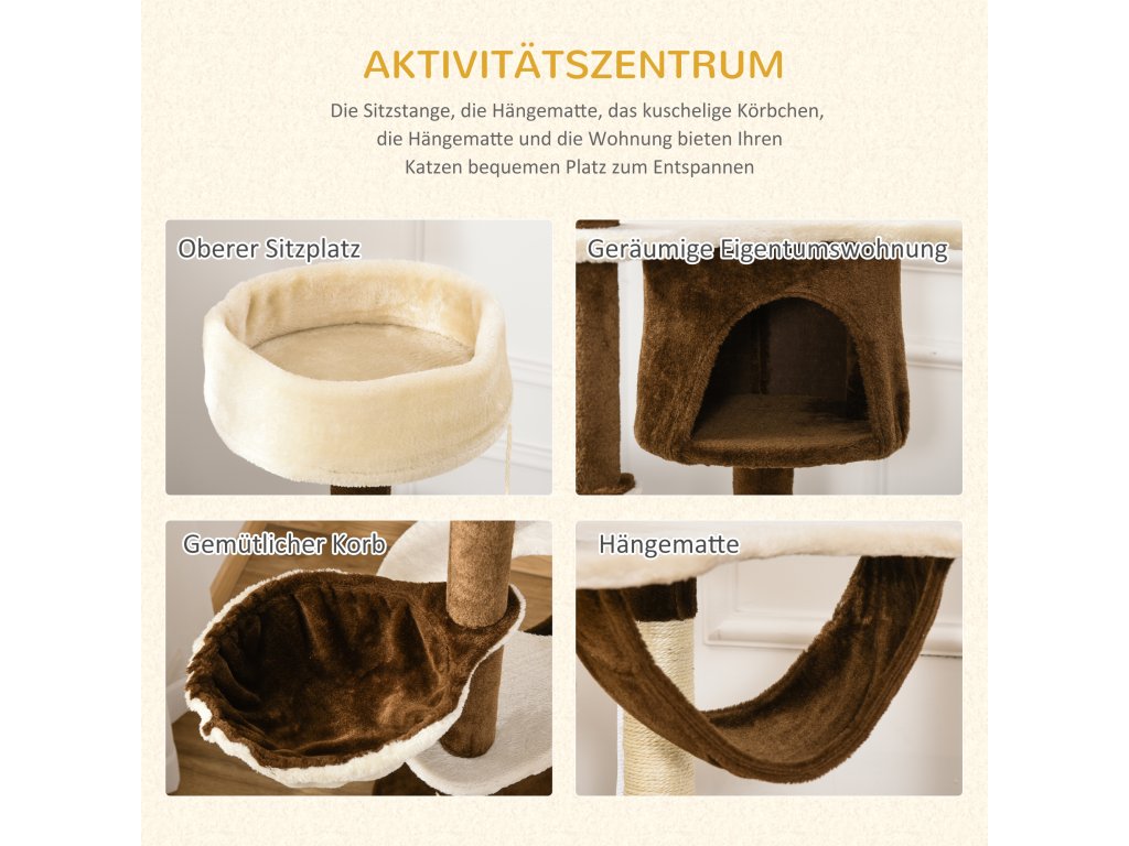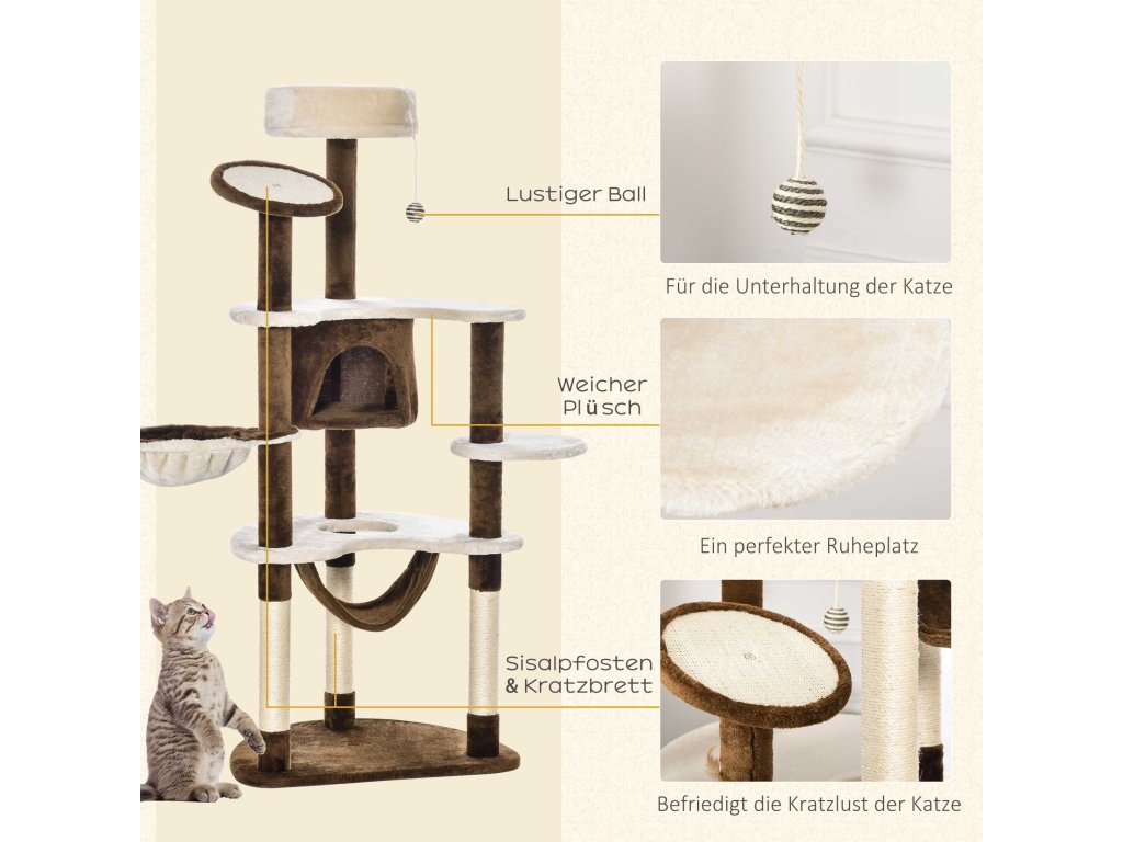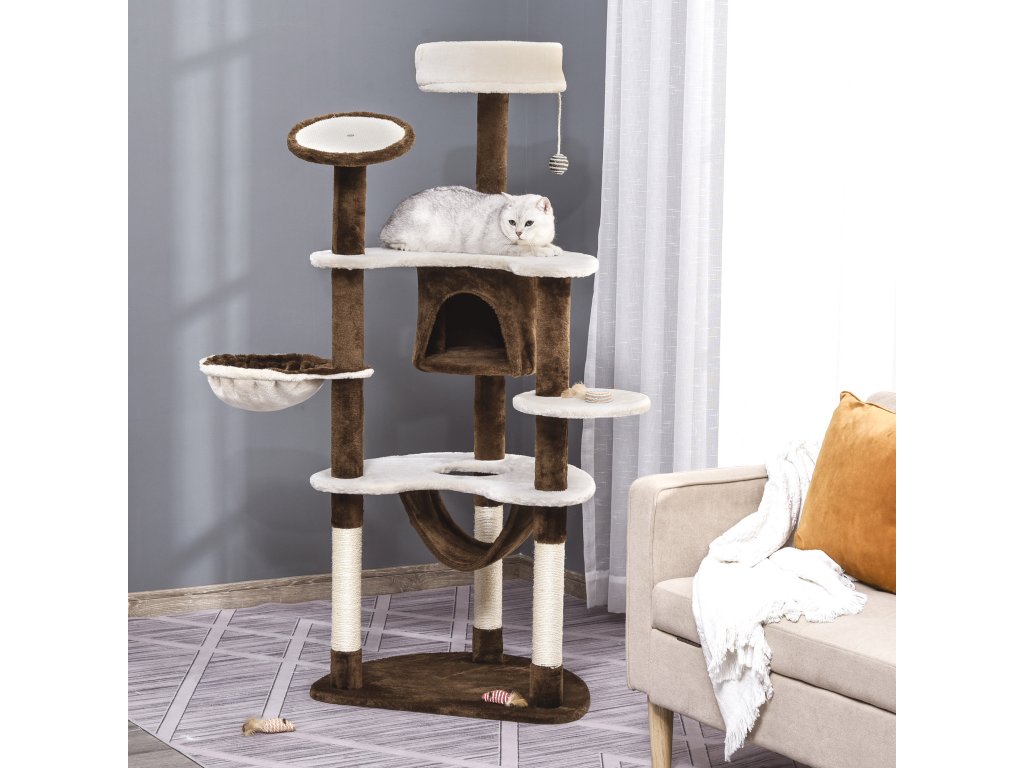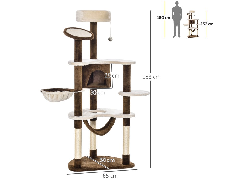 PawHut Škrabací strom s kočičí jeskyní Houpací síť XXL Strom pro kočky Šplhací strom pro kočky Víceúrovňové multifunkční centrum Plyšová hnědá 65 x 50 x 153 cm