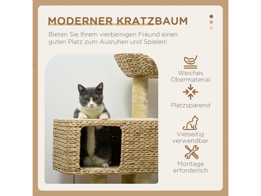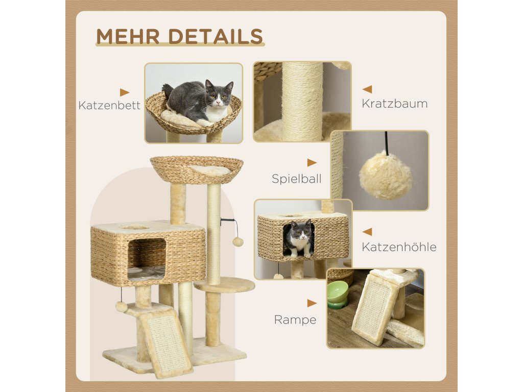 PawHut škrabadlo pro kočky, 1 jeskyně pro kočky, 1 pelíšek pro kočky, 1 plocha na ležení, 1 rampa, 60 cm x 40 cm x 98 cm, přírodní + béžová barva