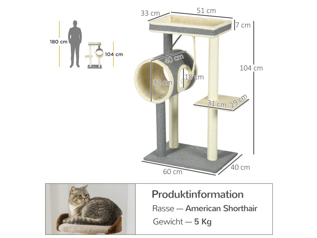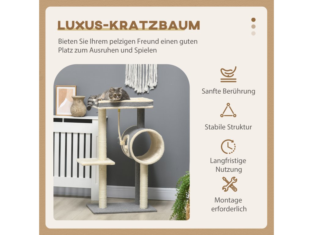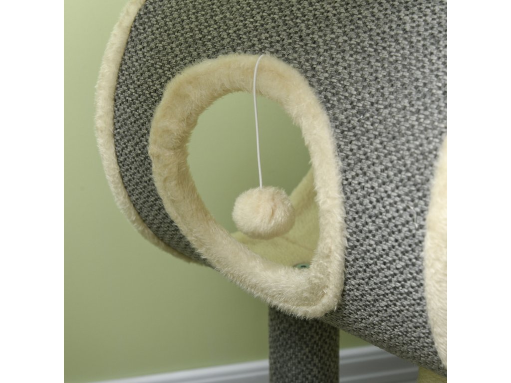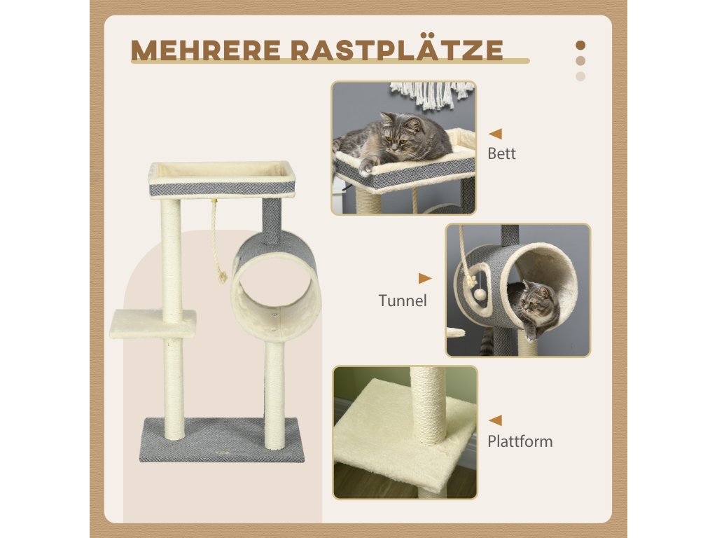PawHut škrabadlo pro kočky, 1 jeskyně pro kočky, 2 plochy na ležení, 60 cm x 40 cm x 104 cm, šedá + příroda