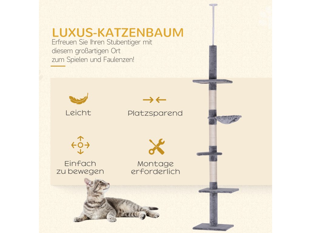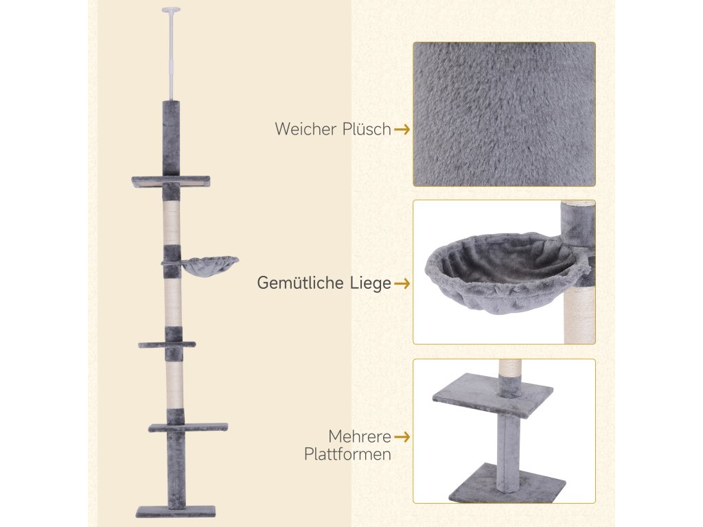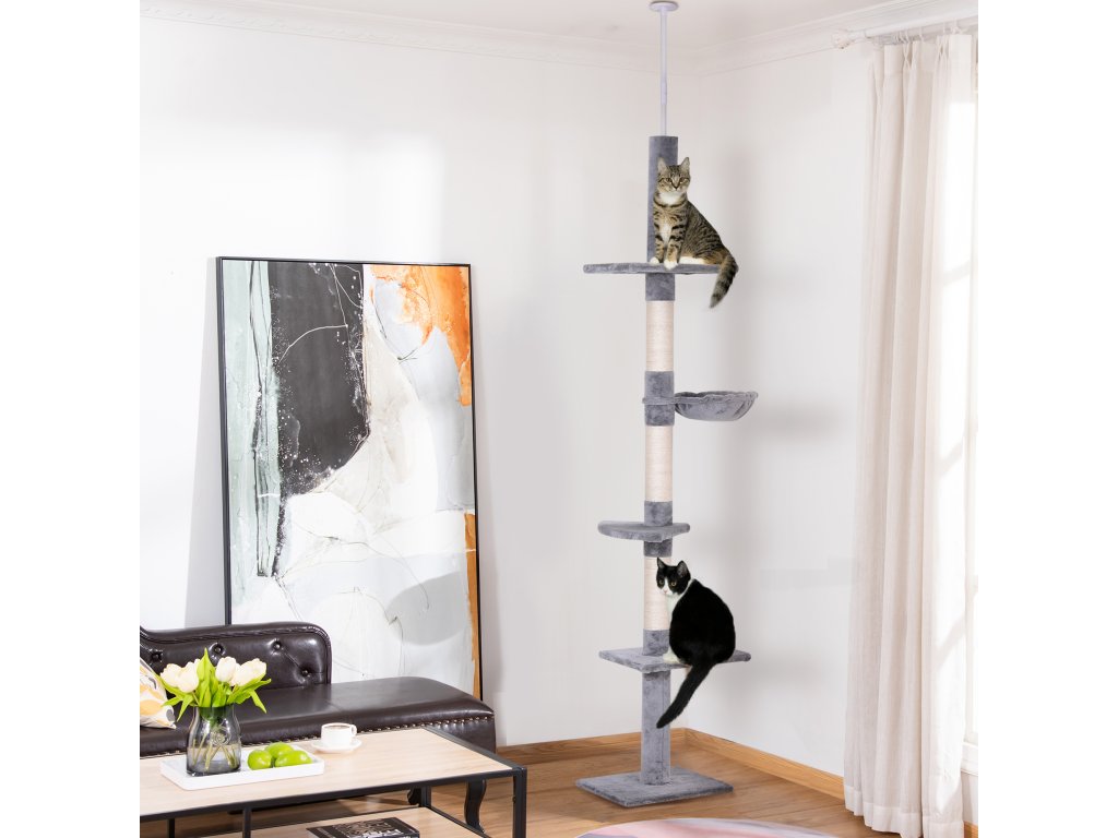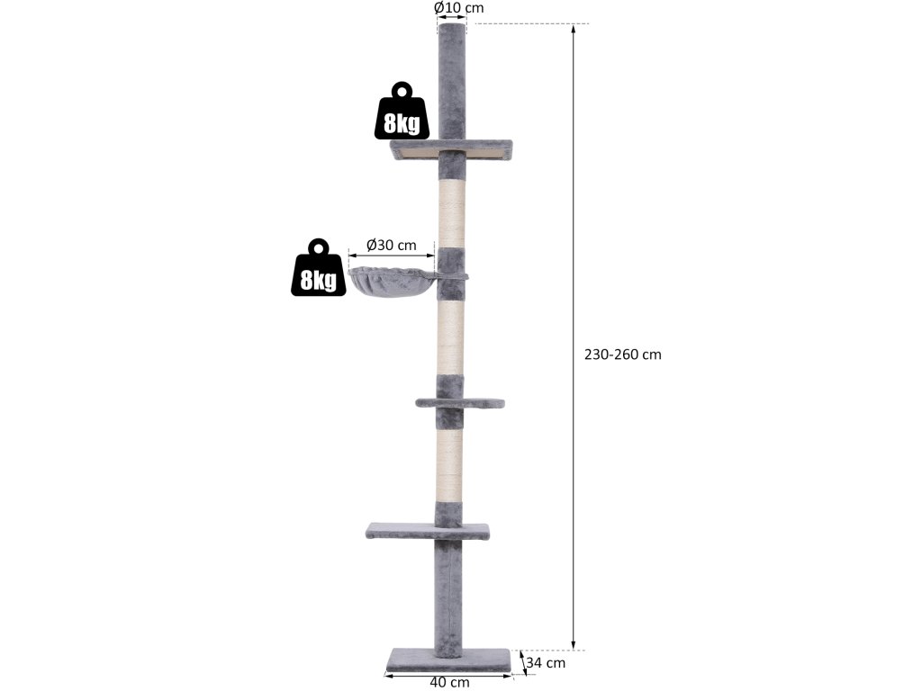 Podrobnosti o produktu: Celkové rozměry: D40 x Š34 x V230–260 cm, Nosnost: celkem 15 kg, 8 kg na plošinu. Ideální pro šplhání a hraní s vaší kočkou.