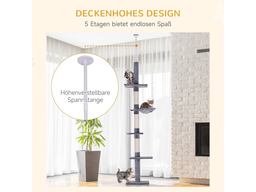 Udělejte svým chlupatým kamarádům radost tímto pětipatrovým škrabadlem pro kočky. Mezi podlahou a stropem jsou rozmístěny různé útulné plyšové plošiny, ideální pro lezení a odpočinek, kde si vaše kočka jistě ráda užívá čas. Prostřední sloupek je obalen sisalem, což umožňuje vašim kočičím společníkům brousit si drápy, aniž by poškodili váš nábytek. Tento škrabadlo pro kočky potěší nejen kočky, ale i jejich majitele!