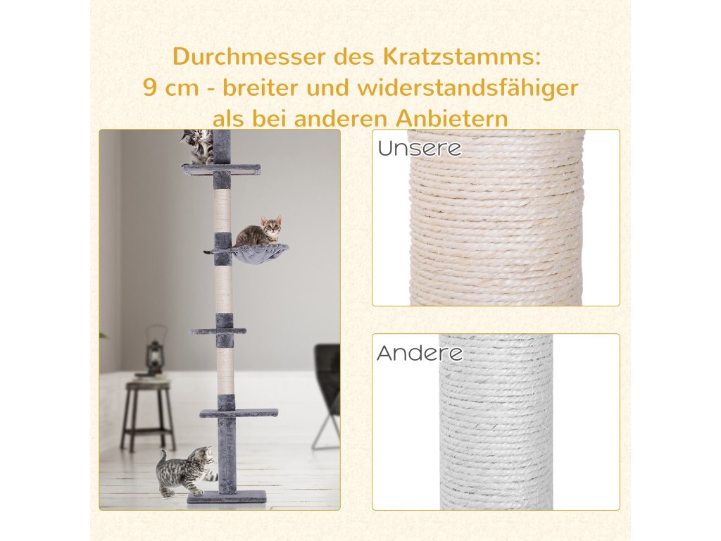 Pozor: Škrabadlo pro kočky musí být pro bezpečnou stabilitu upnuto mezi podlahou a stropem. Je vhodné pro stropy do výšky 260 cm.