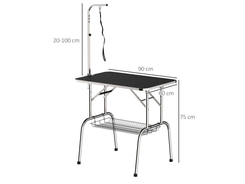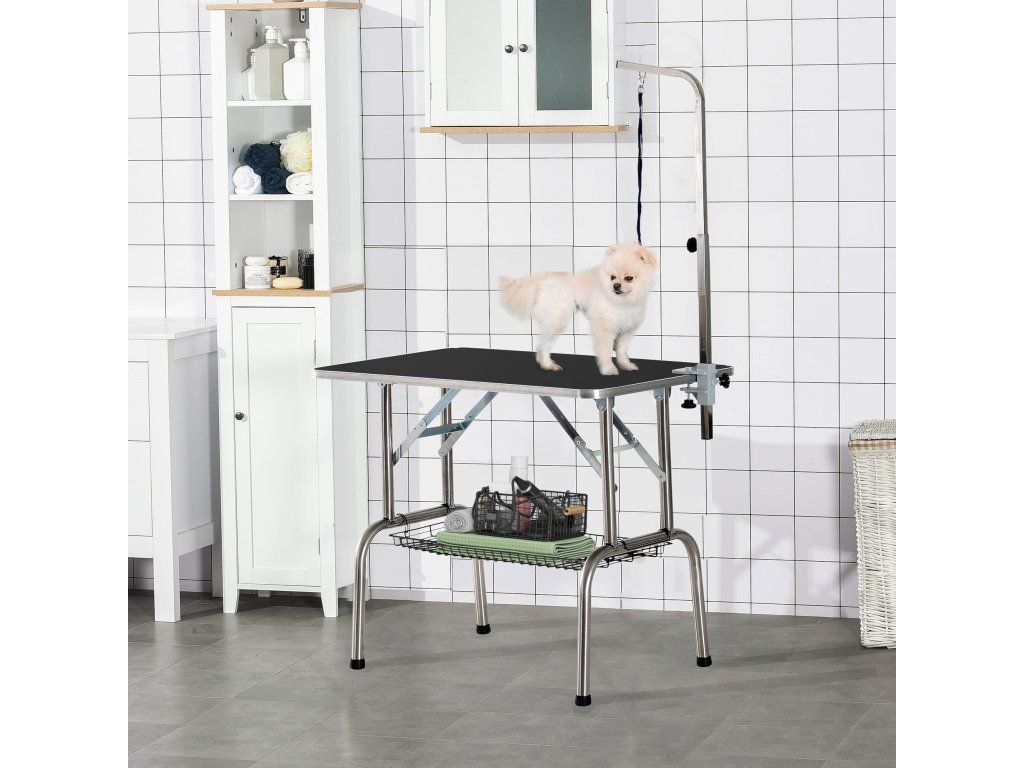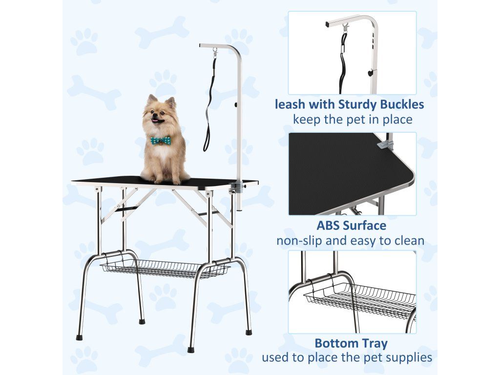 PawHut Stůl na stříhání pro psy Skládací stůl na stříhání psů, stůl na stříhání domácích mazlíčků s výškově nastavitelným ramenem, popruhy, síťovým košem, stůl na stříhání do 150 kg, 90 x 60 x 75 cm, černý