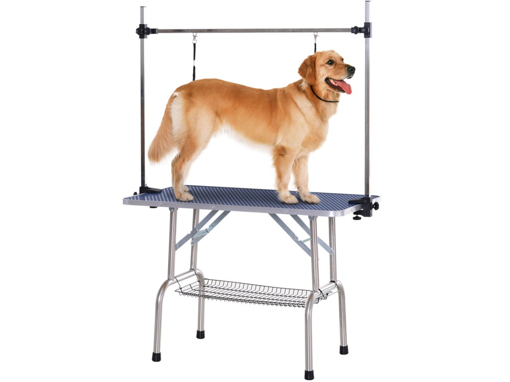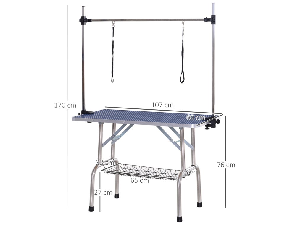 - Údaje o výrobku stolku na úpravu psů: 107L x 60W x 170H cm. Nastavitelná výška: 20-80 cm. Maximální hmotnost zátěže: 100 kg. Nutná montáž.