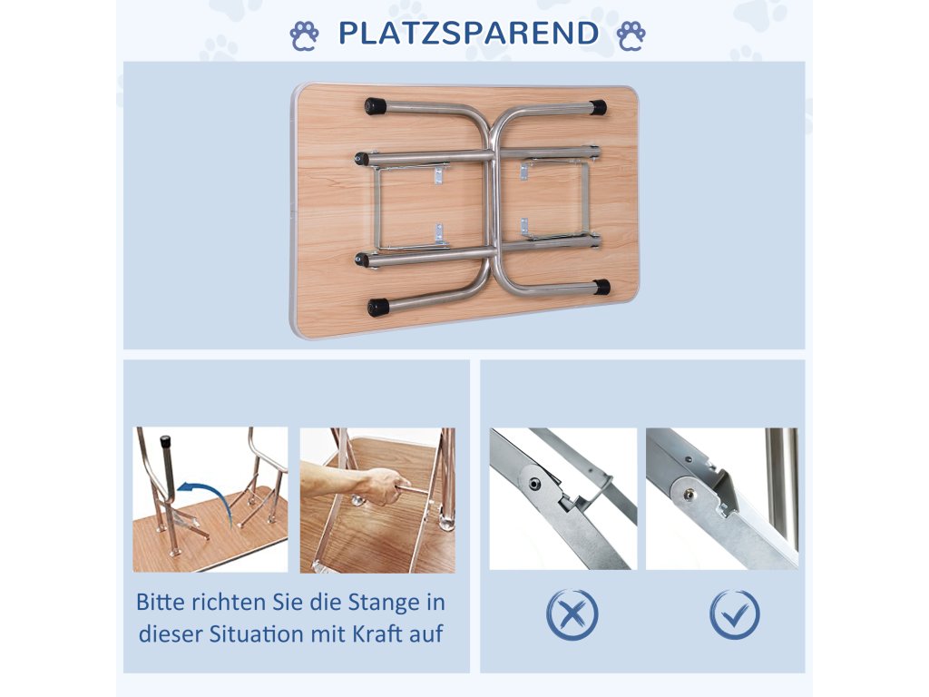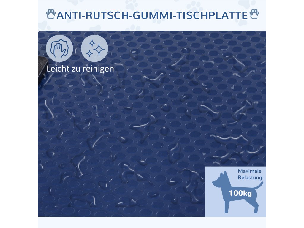 - ✔ Protiskluzová gumová deska stolu zabraňující uklouznutí vašeho psa a zaoblené rohy zabraňující nehodám