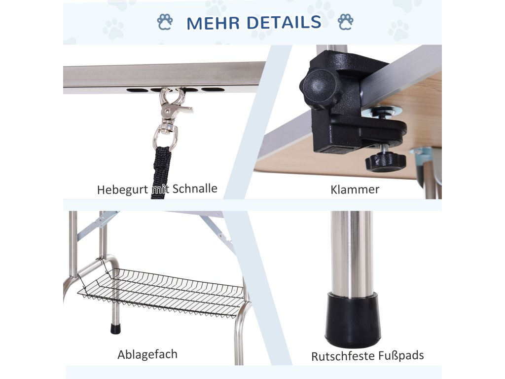 - Protiskluzový povrch: Gumová podložka, která udrží vašeho psa v klidu a pohodlí po dlouhou dobu. Zaoblené rohy stolu na stříhání, které zabraňují zranění, se dvěma popruhy, které udrží vašeho psa na místě při stříhání.