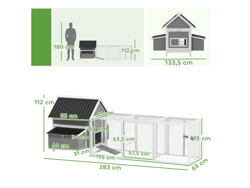 Prostorná obytná plocha: Rozměry 283 Š x Tento kurník o rozměrech 133,5 H x 112 V cm poskytuje dostatek prostoru pro 7–10 kuřat, včetně dvou hnízdních budek přístupných shora a prostorného výběhu pro vaši drůbež, kde se může pohybovat a odpočívat.